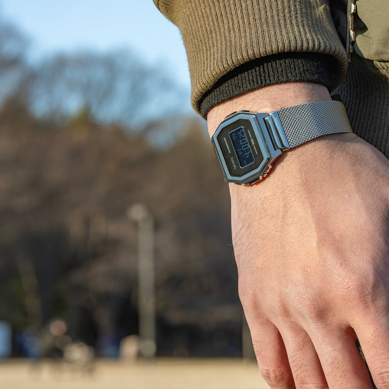 | カシオA1000は、カシオ・デジタルの最上位クラスに位置する、プレミアムな腕時計です。ケースとベルトは、最高品質のステンレス素材で成形されており、耐久性に優れています。エッジが程よく丸めてあるため、感触が滑らかで実にエレガントです。ボタンの機能表記を裏蓋に移すことで、文字盤も美麗な外装にふさわしいデザインになっています。CASIOのロゴとディスプレイの窓枠は、高級感を強調するがごとく、立体構成の別パーツです。裏蓋の仕上げも美しく、ポリッシュとヘアライン加工をミックスするほどの徹底ぶりで、CASIOのロゴや、ボタンの機能表記も鮮明に刻印されています。 | |