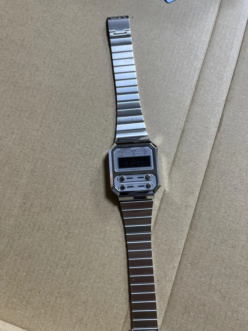 | カシオA100は、同社初の樹脂ケースモデルF-100(1978年発売)を復刻した、レトロなデジタルウォッチです。先代のF-100はG-SHOCKに先駆けたカシオのヒット商品で、1979年公開の映画「エイリアン」でシガニー・ウィーバー演じる主人公のリプリーが着用するなど、世界的な人気を博しました。40年以上の時を経て復刻されたA100は、ケース前面に操作ボタンを配置した独特なデザインはもちろんのこと、細部に至るまでオリジナルの意匠が忠実に再現されています。加えて、ケース・ボタンの金属感あふれるメッキ処理や、ボタン配置エリアのクリアーパーツによる質感向上など、細部のアップグレードも行われており、単なる復刻にとどまりません。耐久性の高いステンレス性のベルトや、残照機能付きのLEDライトを採用するなど、実用面も強化されています。 | |