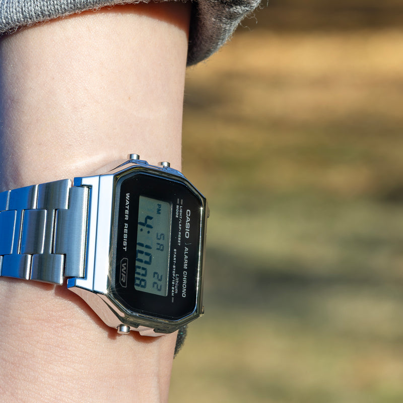 カシオA158は、視認性も極めて高く、画面に黒インクで直接印刷してあるのか?と錯覚するほど、鮮明に時刻が表示されます。修正作業は、最短で5回ボタン押をすだけで完了するお手軽さです。A158WEA-9はインスタであいみょんさんが投稿していたこともあり、あいみょんモデルとしても有名です。 | |