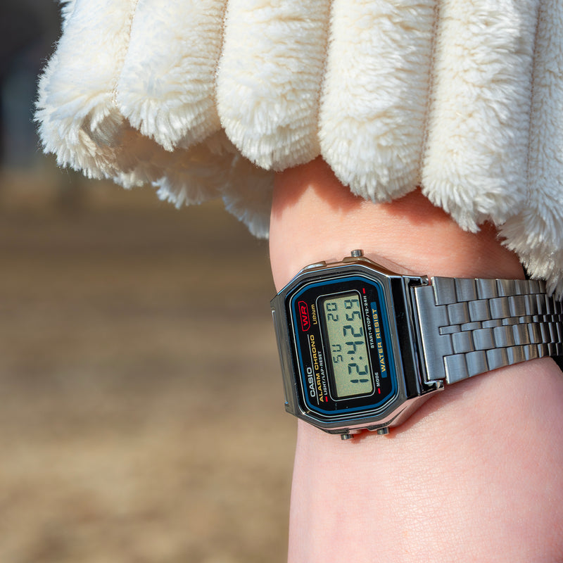 カシオA159は、日本国内で生産されている、希少価値のある腕時計です。他のチープカシオは、海外生産品ですが、A159は山形工場での生産です。2018年のプレスリリースによると「月産10万個を想定している。生産効率が3倍に向上し、コストは半分と中国工場並みに下がる」とのこと。「人気が高い『メード・イン・ジャパン』と海外並みの低コストを両立させる」狙いもあったようで、同社の力の入れようが伝わってきます。その一方で、日本国内では販売されていないという側面もあり、少し不思議な感じです。平成元年(西暦1989年)発売当初から変わらない、レトロデザインが人気の秘密。海外では、カシオ・ビンテージの愛称で親しまれています。ケースは158と共通ですが、文字盤とベルトのデザインが異なり、A159のほうが幾分繊細なイメージです。ゴールドバージョンが存在するのも、A159ならでは。使い勝手も158譲りで申し分なく、まさにチープカシオを代表する腕時計と言えるでしょう。 | |