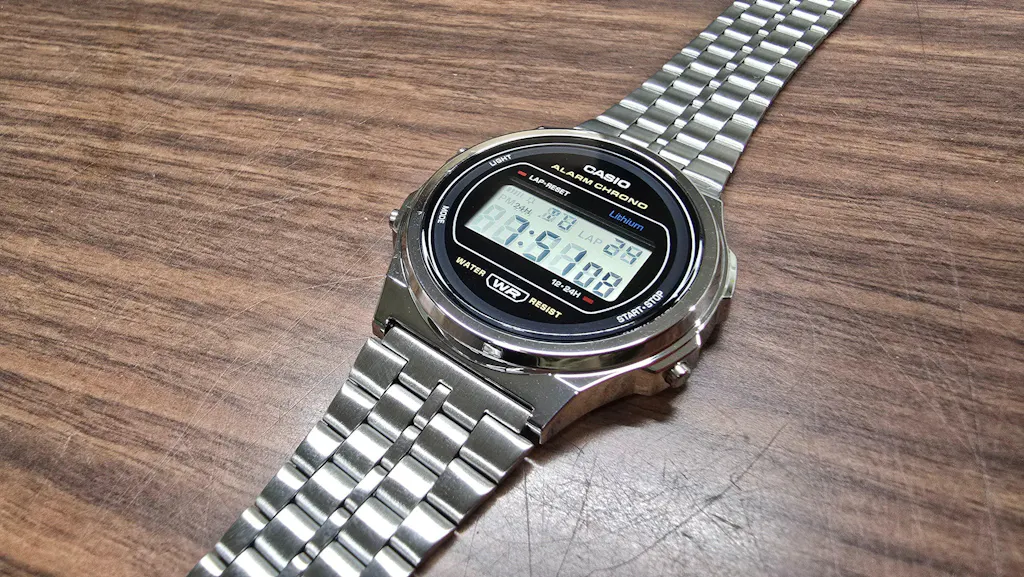 | カシオA171は、エレガントなラウンドケースを身にまとった、格調高い腕時計です。デジタルウォッチ登場初期に広く用いられたラウンドケースに、どこか郷愁を覚えます。文字盤も極めて美麗で、色使いを抑えた落ち着きのある面持ちです。無機質になりがちな機能表記文字列も、円形の盤面に溶け込むように美しく整列されています。ケースは樹脂製ですが、メッキの質感が高いうえ、ディテールもシャープに成型されているため樹脂ケースのハンディは感じられません。ジェンダーレスなデザイン&サイズで、幅広くご利用いただけます。 | |