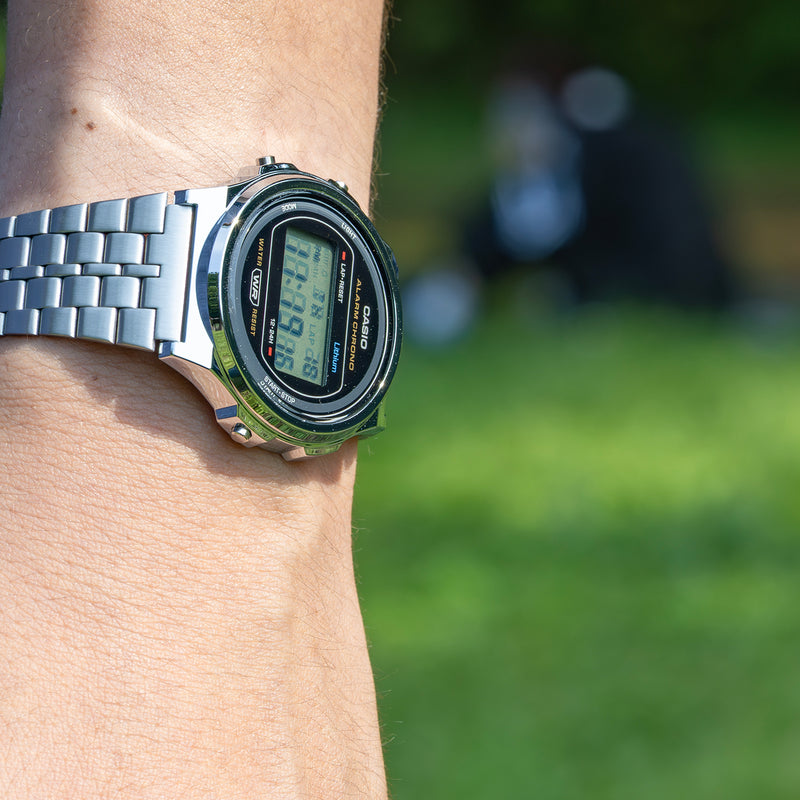 カシオA171は、エレガントなラウンドケースを身にまとった、格調高い腕時計です。デジタルウォッチ登場初期に広く用いられたラウンドケースに、どこか郷愁を覚えます。文字盤も極めて美麗で、色使いを抑えた落ち着きのある面持ちです。無機質になりがちな機能表記文字列も、円形の盤面に溶け込むように美しく整列されています。ケースは樹脂製ですが、メッキの質感が高いうえ、ディテールもシャープに成型されているため樹脂ケースのハンディは感じられません。ジェンダーレスなデザイン&サイズで、幅広くご利用いただけます。 | |