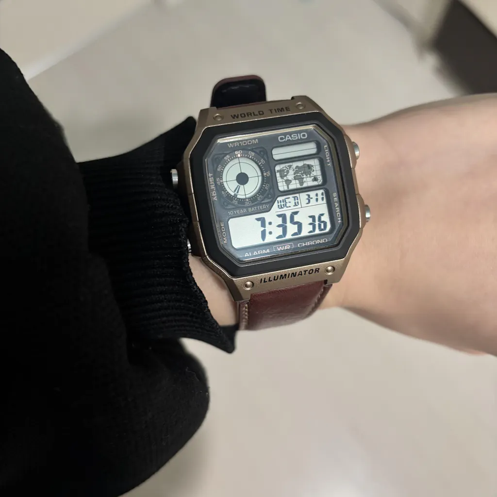 | カシオAE-1200は、同社製デジタルウォッチの魅力が凝縮された1本です。ひときわ目立つ円形の液晶ディスプレイは、マルチセグメントで表示するアナログ時計。セグメントのオン・オフにより、デジタル的に時刻を表示することから、海外カシオではデジタル・ダイアルと呼んでいます(日本国内版の呼称は液晶アナログ)。このデジタル・ダイアルには、ホーム都市の時刻が常時表示されるので、ストップウォッチなどの付加機能の使用中でも、現在時刻が確認できます。右隣の世界地図は、この腕時計の目玉機能。下段に表示されている時刻のエリアを、世界地図上にマッピングして指し示します。3文字の都市コードも併記されますが、視覚的に把握できるマップ表示の方が、分かりやすくて便利です。各都市の日付も表示されるので、日付変更線を意識する必要もありません。その他の機能も充実しており、アラーム、ストップウォッチ、カウントダウンタイマーが使えます。とくに便利なのがアラーム機能。個別に設定可能な5本のアラームがあるうえ、5本ともワンタイム・アラームが設定できる優れものです。ワンタイム・アラームとは、設定時刻に音がなったら自動的に解除される、一度きりのアラームのこと。ワンタイム・アラームを活用すれば、解除忘れによるアラームの不意打ちに、慌ててしまうこともありません。もちろん、毎日鳴らすことも可能です。ストップウォッチや、カウントダウンタイマーまでついているので、時間管理はこれ1本で事足ります。ケースは樹脂製ですが、光沢が抑えられた表面処理が施されているので、安っぽさはありません。デジタル・ダイアルが照準器を模したデザインになっているなど、遊び心もたっぷりです。LEDライトの残照時間も変更できます。まさに、細部までこだわり抜かれた、チープカシオ最高峰モデルといえるでしょう。 | |