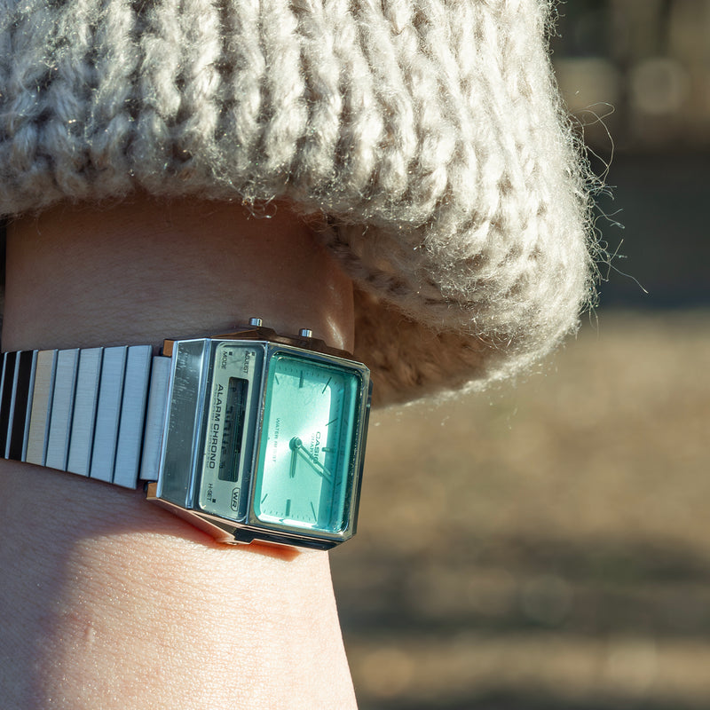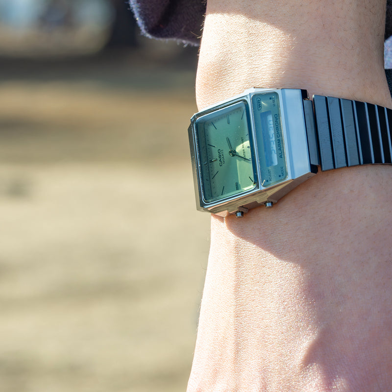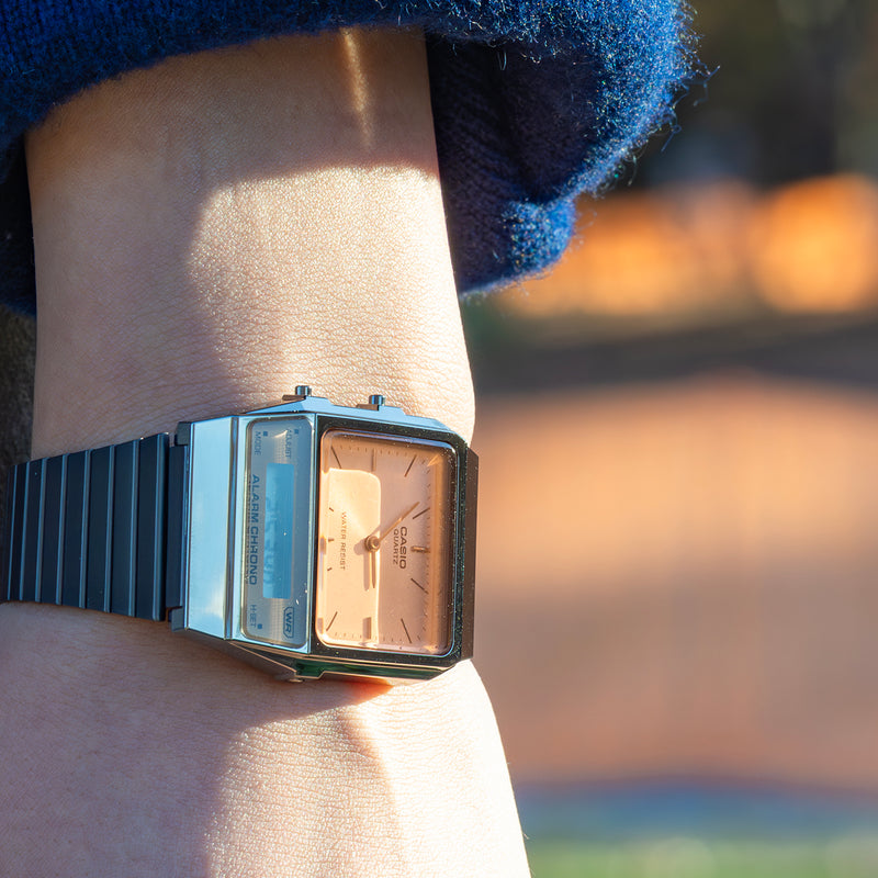 1980年代発売のAQ-450をモチーフにし、レトロとスタイリッシュが融合した新型モデルです。文字板と液晶が独立したデザインで、アナログの美しさとデジタルの機能性を両立。アナログ文字板はシンプルなバーインデックスと時分針で構成。ケース液晶部はトップ面を傾斜させたスタイリッシュな形状に仕上げています。また角型フォルムのケースと横長の駒形状を採用したメタルバンドを組み合わせることで、面構成が際立つスタイリッシュな外観に。ストップウオッチ、アラーム、デュアルタイム等、日常生活に便利な機能も備えています。オンオフ問わずコーディネートに合わせやすい時計です。 | |
