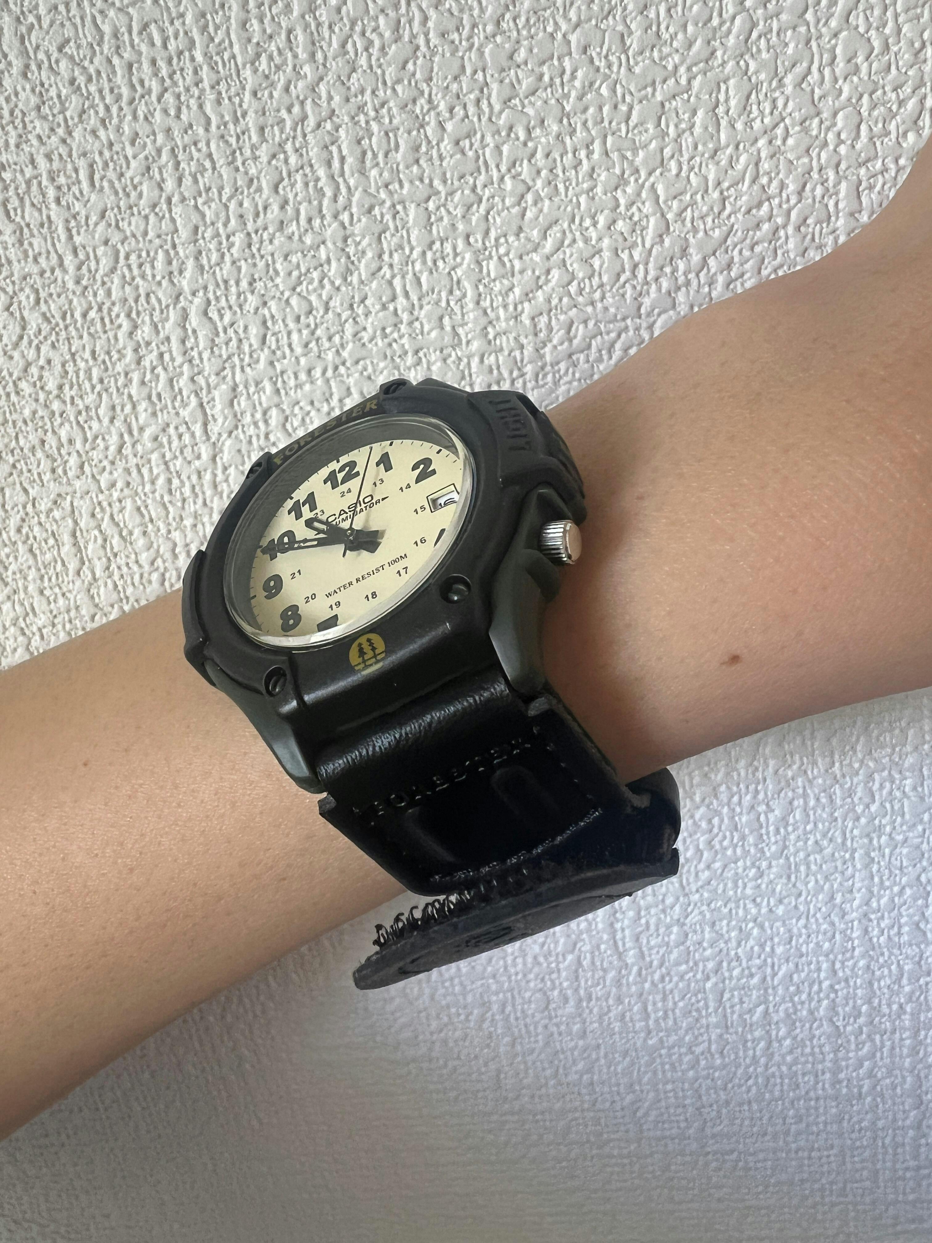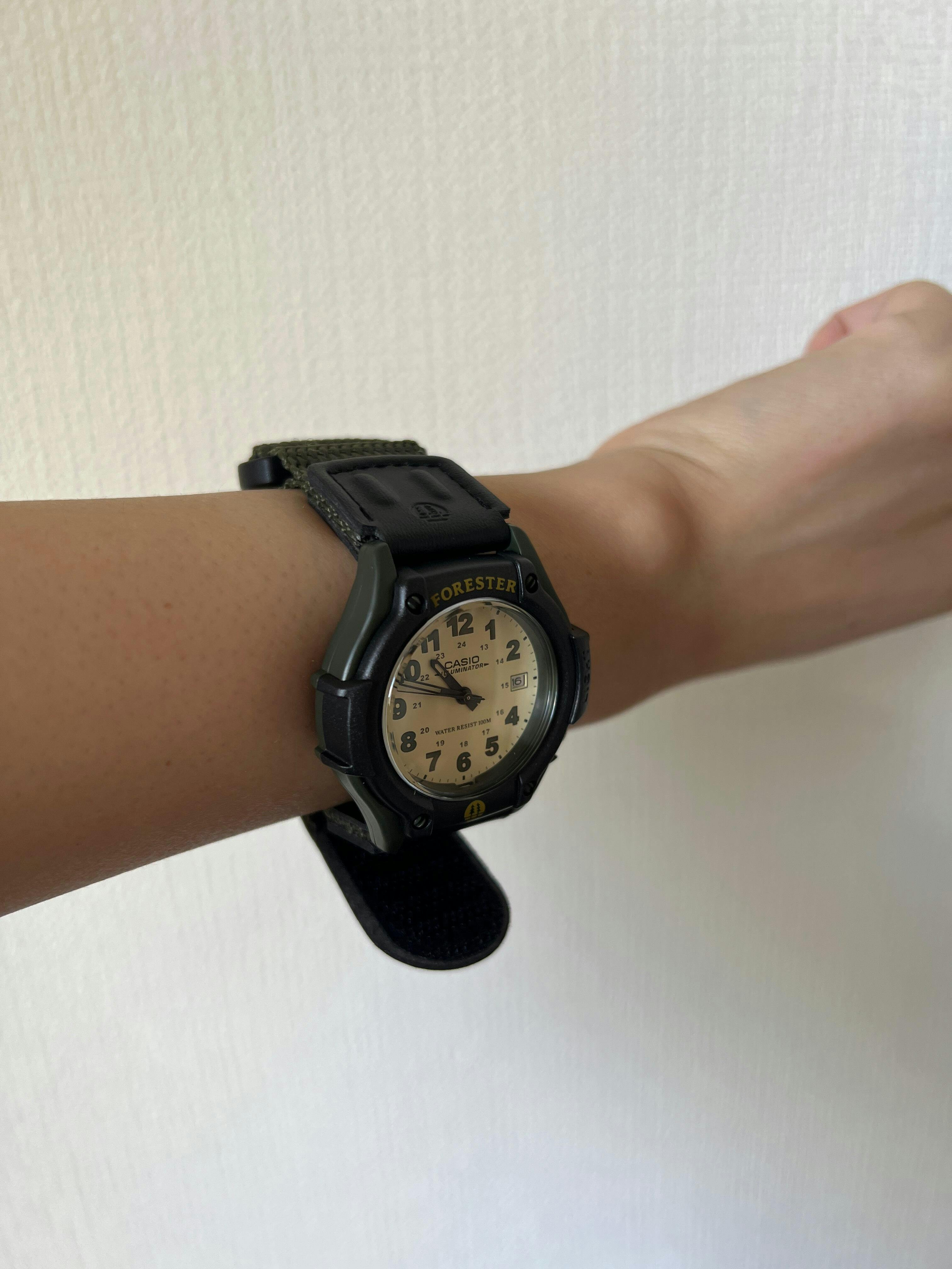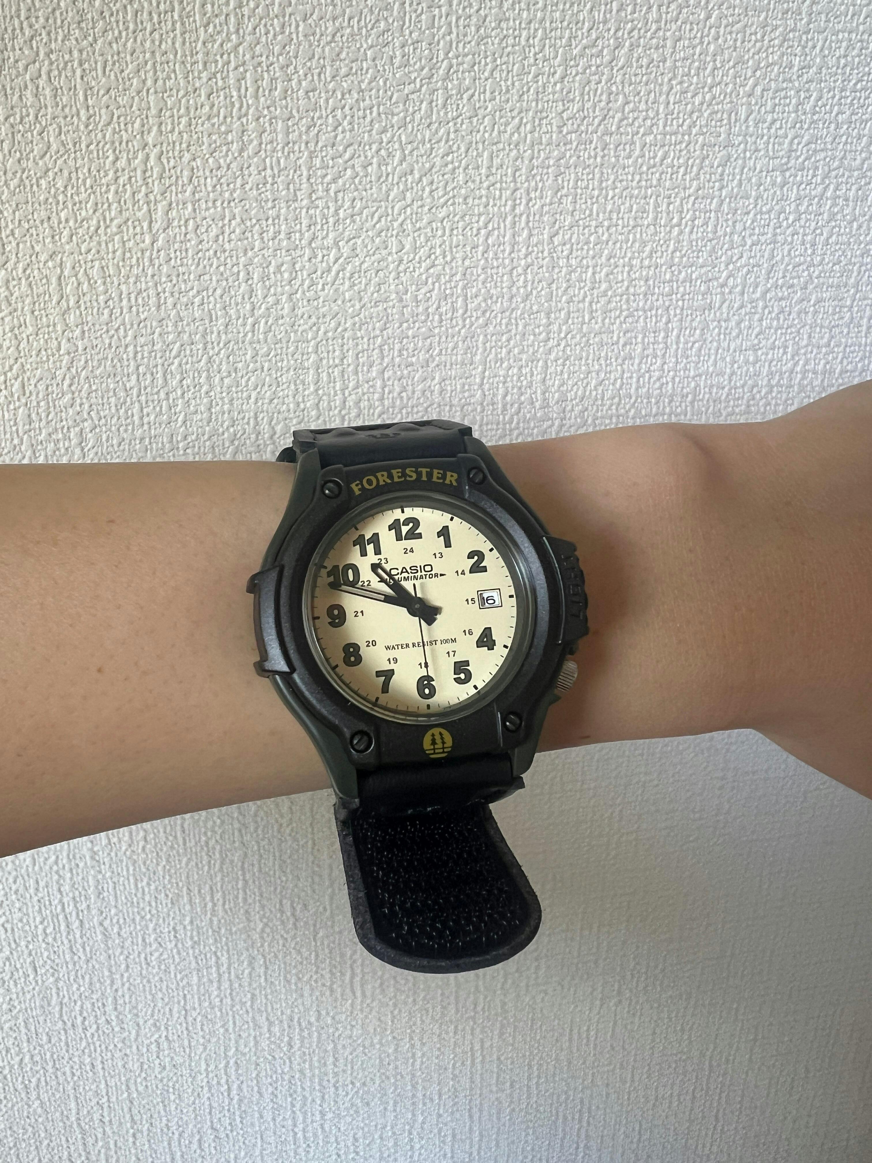 | カシオFT-500WCは「FORESTER(フォレスター)」の名を冠した、アウトドア志向のアナログウォッチです。FORESTER(林業技術者)という名のとおり、バンドはフィールドワークの服装に馴染むように、面ファスナー式のストラップが採用されています。革とナイロンを組み合わせたストラップは、濡れた手でも滑らず、厚手のウェア上にも装着可能なため、フィールドワークにおいても頼もしい存在です。リューズは4時位置にオフセットされ、手の甲への干渉を避ける設計になっています。3時位置にはリューズガードを兼ねた、ライト点灯用ボタンをさりげなく設置するという、こだわり抜かれた設計です。ボタンを押すと、オレンジ色のLEDが文字盤を約3秒間、明るく照らします。ケースとバンドは、ブラック、ブラウン、カーキの3色展開。文字盤もそれぞれの色にマッチした配色で、全体的に統一感のあるタフな印象を演出しています。インデックスは太めのアラビア数字で、日陰や夕暮れ時でも視認性は抜群です。3時位置には日付表示があり、インデックスの内周には24時間表示スケールもプリントされています。ケースは10気圧防水が確保され、ビジュアルもカジュアルすぎず無骨すぎないバランスの取れたデザインです。ベゼル下部には、針葉樹をかたどったシンボルが控えめにあしらわれており、自然とのつながりをそっと感じさせてくれます。普段使いはもちろん、野外活動にも寄り添ってくれる、頼れるフィールドウォッチです。 | |