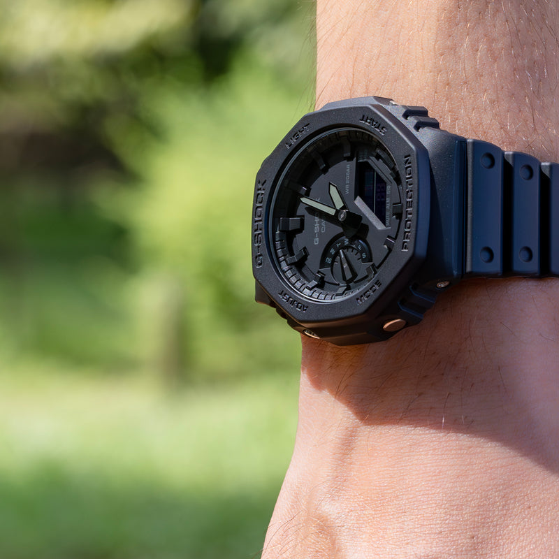 究極の強さを求めて進化を続けるタフネスウオッチG-SHOCKから、初代モデル“DW-5000C”のコンセプトを受け継ぎ、更なる薄型化を果たしたデジタル・アナログコンビネーションモデルです。初代モデル“DW-5000C”にも採用された“八角形フォルム”を継承。タフな構造はそのままに無駄を省いたシンプルなデザインのコンビネーションモデルを開発しました。更にケース素材には、高剛性を発揮するカーボン繊維入りファインレジンを使用し、厚さ11.8mmを実現しました。カラーはG-SHOCKらしいブラックアウトを採用しています。 | |