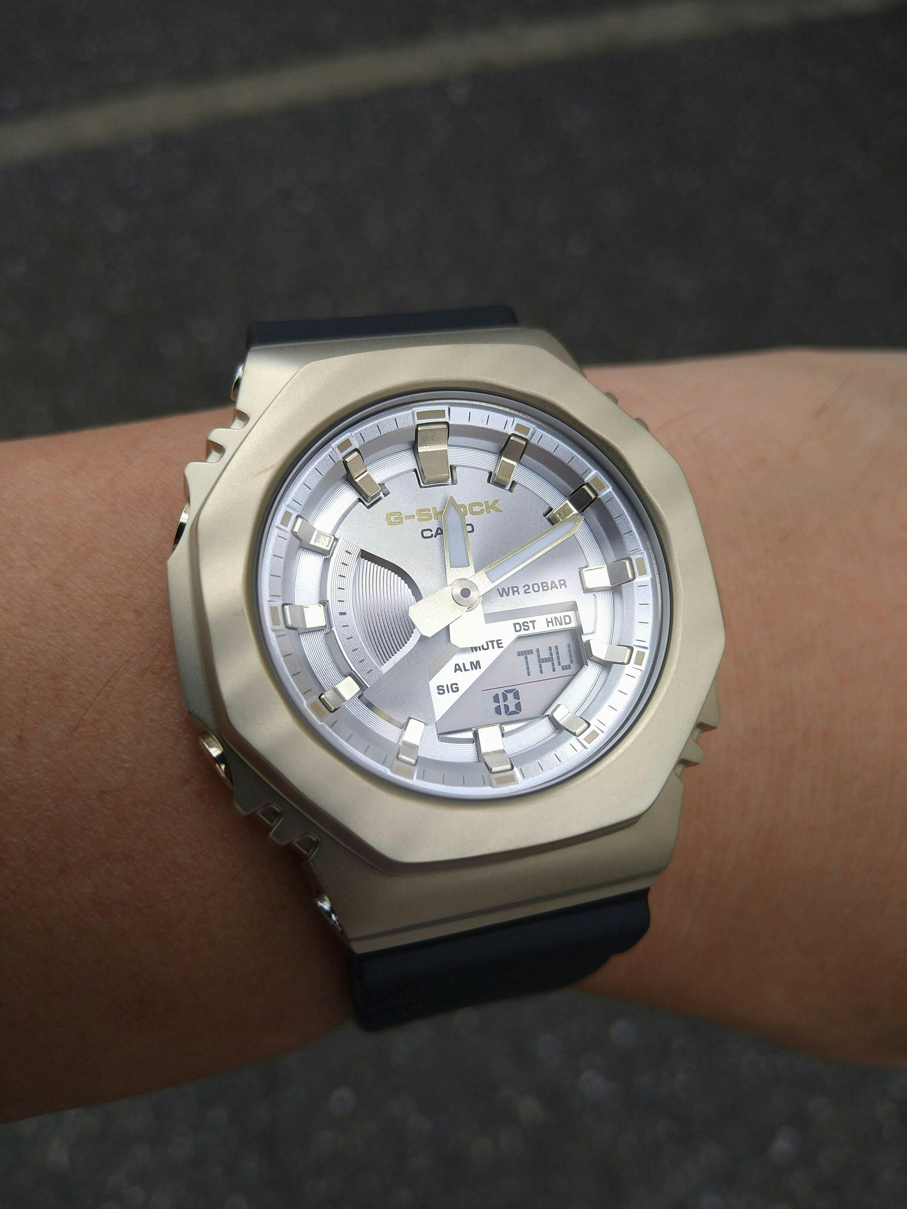 ケース:樹脂 / ステンレススチール(ライトイエローゴールドIP(ベゼル部)) ベルト:樹脂バンド 風防:無機ガラス |