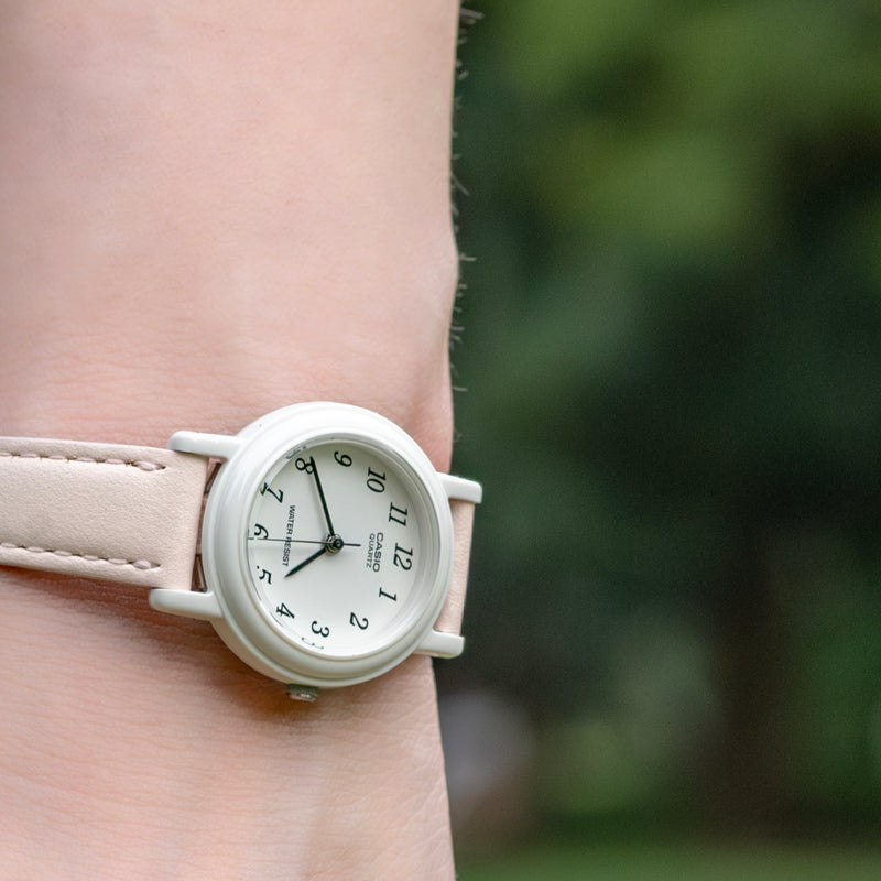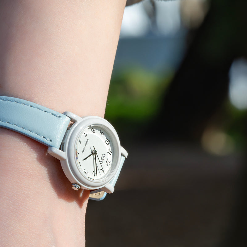 カシオLQ-139Lは、小ぶりなラウンドケースに、パステルカラーのレザーベルトを組み合わせた、柔らかなトーンの腕時計です。ケースは樹脂製ですが、グロスインジェクション成型により、エナメルのような光沢感を持っています。表面から側面まで、パステルカラーに染色・塗装されたベルトは、本革製の切り身仕立て。ステッチとベルトの色味が合わせてあるので、一段と柔らかなイメージになっています。アラビアインデックスとペンシル針の組み合わせは視認性が良く、時計本来の機能性も高い腕時計です。 | |