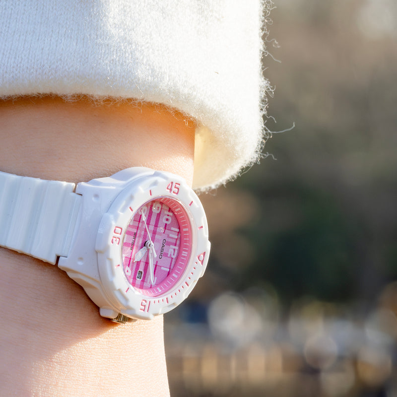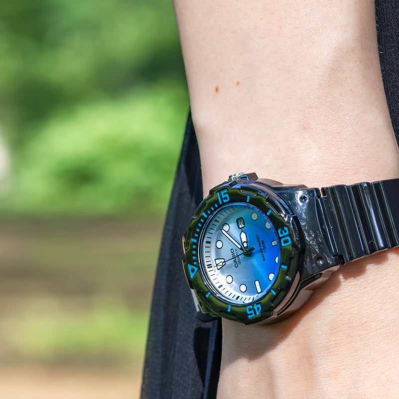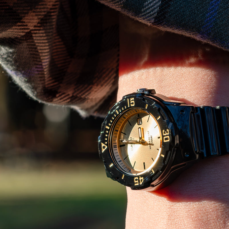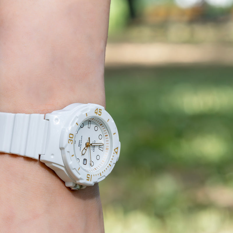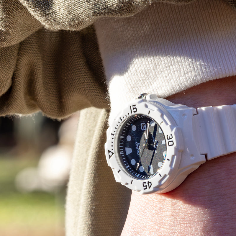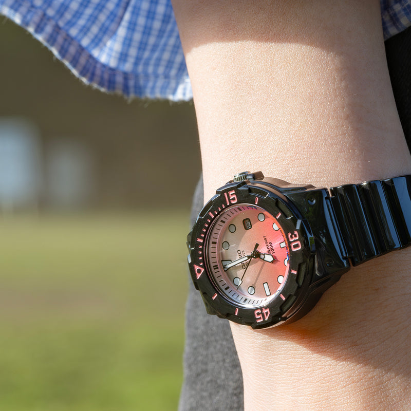 カシオLRW-200は、カジュアルウォッチにダイバーズテイストをミックスした、ファッショナブルな腕時計です。ケースとベルトは、つやつやのグロス調で、とてもキュートに仕上がっています。目立ちにくいバックルやベルトループも、丁寧に彩色してあるところが、さりげなくてお洒落です。リューズを挟む2つの突起は、リューズガードと呼ばれており、その名のとおりリューズを衝撃から守ってくれます。回転ベゼルで時間計測もできるので、実用性も十分です。 | |