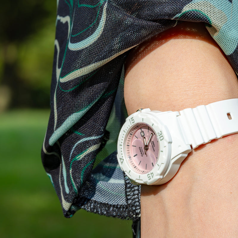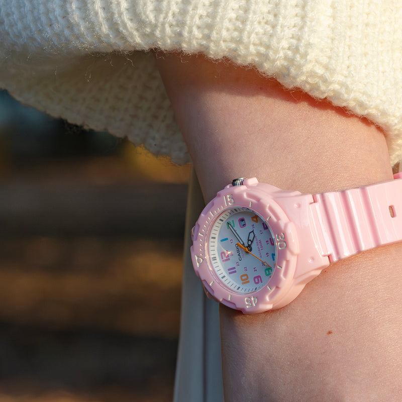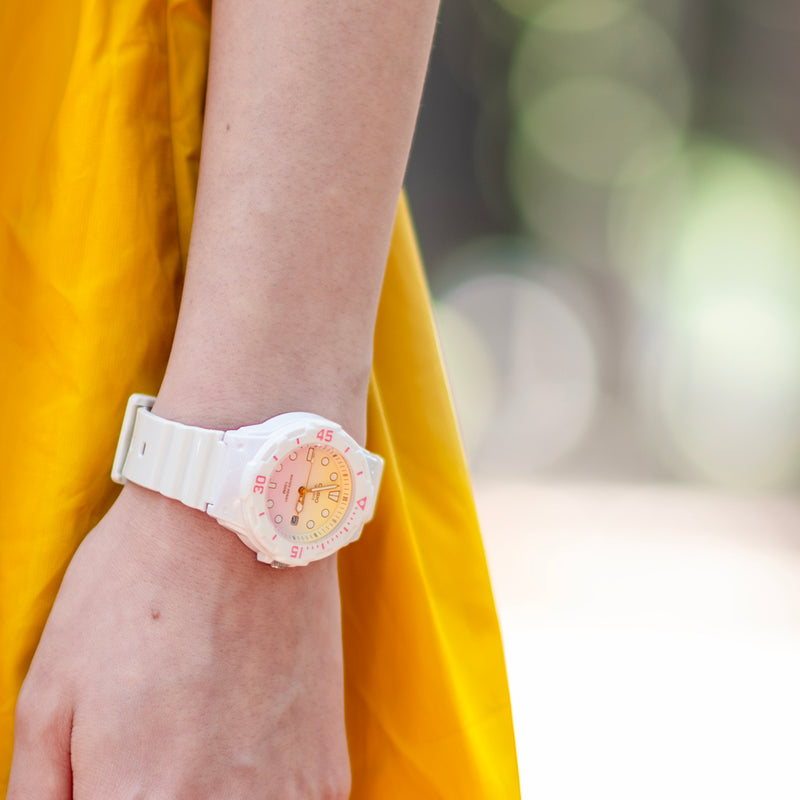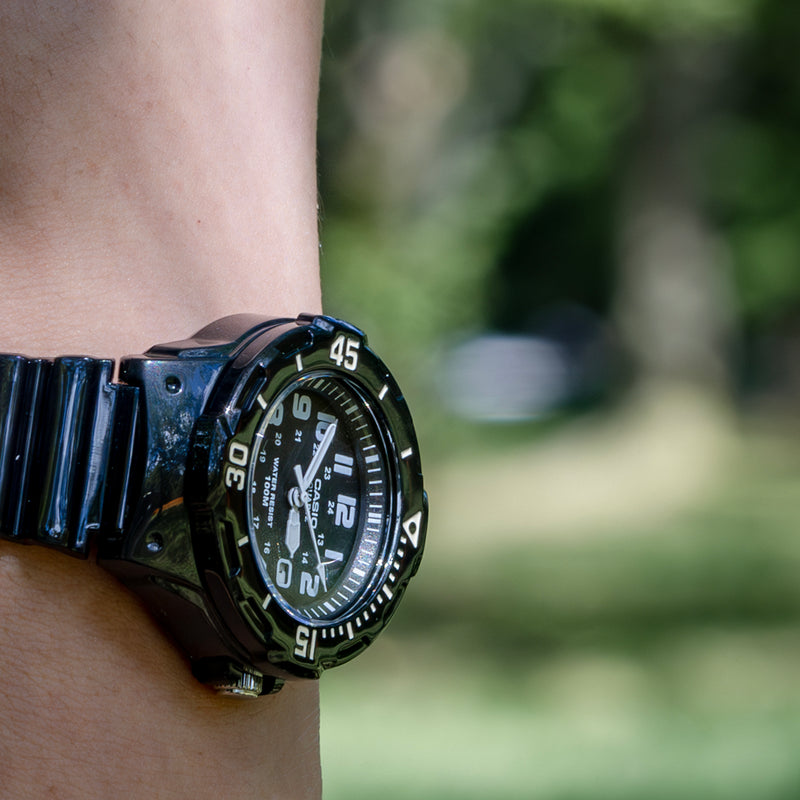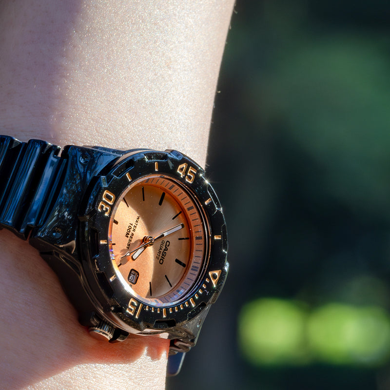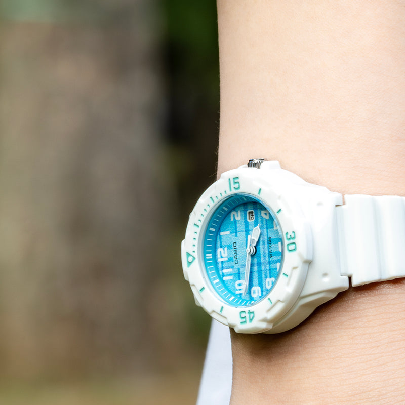 カシオLRW-200は、カジュアルウォッチにダイバーズテイストをミックスした、ファッショナブルな腕時計です。ケースとベルトは、つやつやのグロス調で、とてもキュートに仕上がっています。目立ちにくいバックルやベルトループも、丁寧に彩色してあるところが、さりげなくてお洒落です。リューズを挟む2つの突起は、リューズガードと呼ばれており、その名のとおりリューズを衝撃から守ってくれます。回転ベゼルで時間計測もできるので、実用性も十分です。 | |