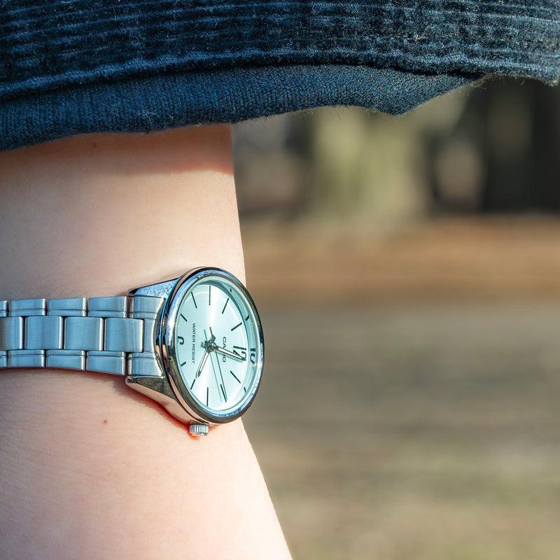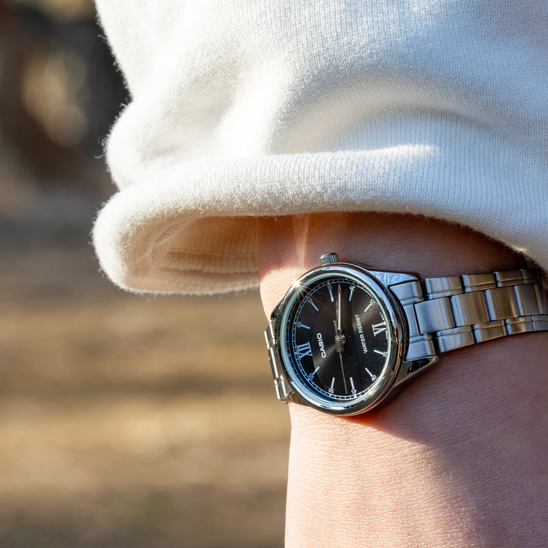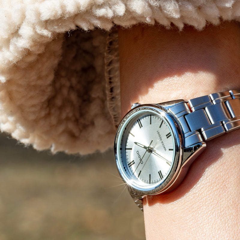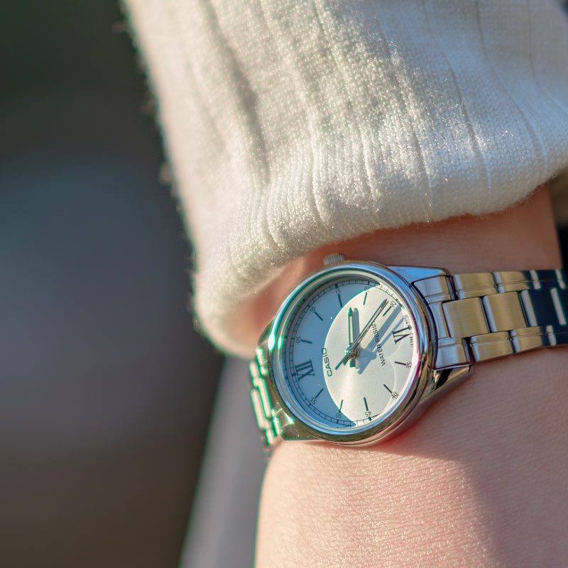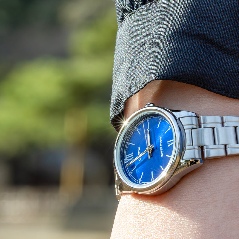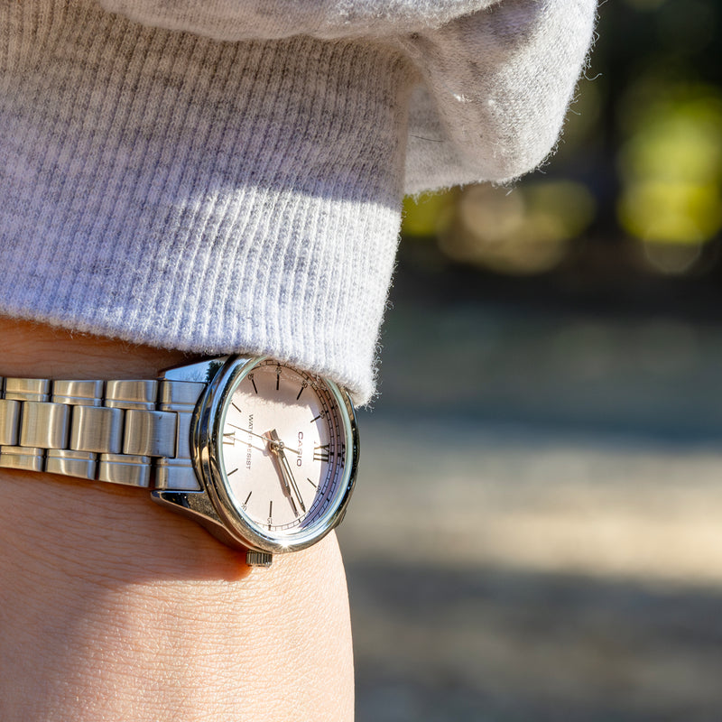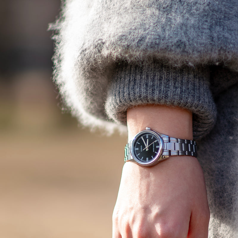 カシオLTP-V005は、腕時計の伝統的なスタイルを踏襲した、オーセンティックなリストウォッチです。没個性にもなりかねない、簡素なデザインでありながら、ベゼルレス構造といったモダンテイストを取り入れるなど、先進的なカシオの心意気が感じられます。ベゼルレス構造により拡張された文字盤は、視認性が高く、ルックスも一段とスマートです。針の長さも、最大化された文字盤に調和するよう、バランスよく整えられています。 | |
