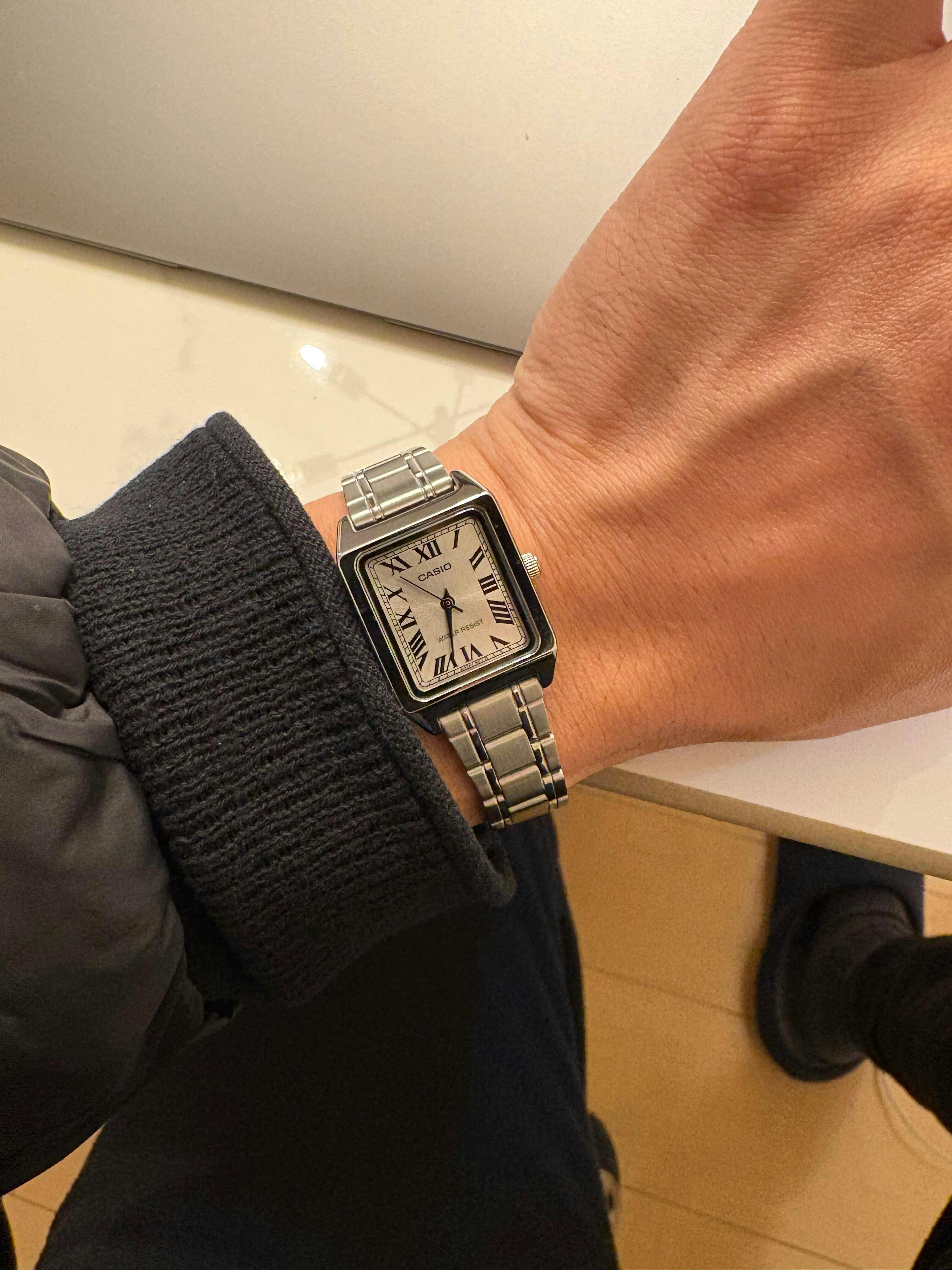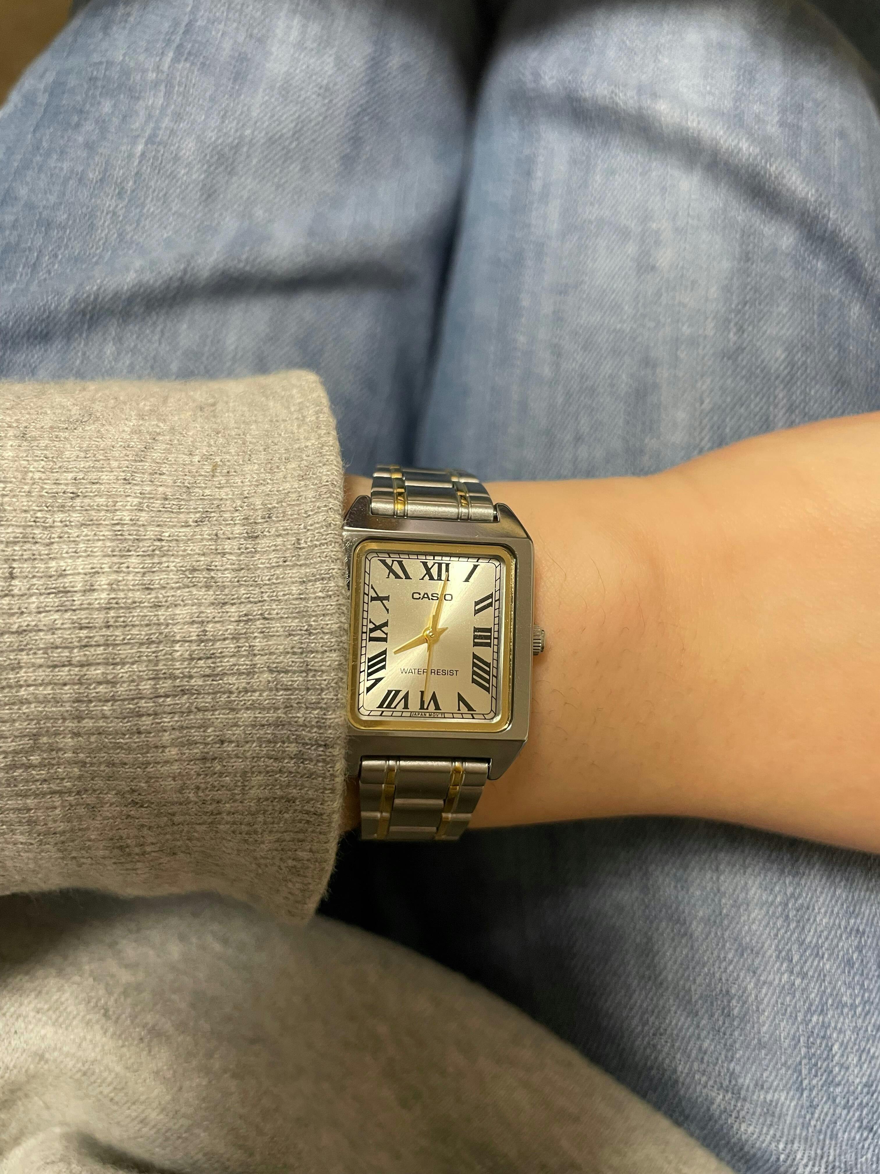 | カシオLTP-V007は、クラシカルな角型フェイスで、文字盤にも落ち着きが感じられるデザインです。商品構成は大きく分けて、ベルトの素材が異なる2ライン(合成皮革とステンレス)。更に、それぞれのラインに、文字盤のデザインが異なるバリエーションモデルが展開されています。この腕時計のゴールドは上品な風合いで、ギラギラ感が極力抑えられています。ドルフィン針という名の、菱形の針が採用されており、クラシカルさをより一層引き立てています。 | |