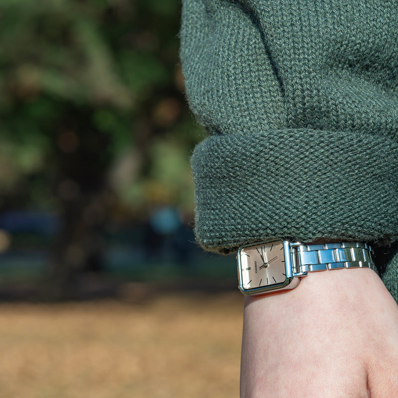 カシオLTP-V009Dは、細身で洗練されたデザインが魅力的な腕時計です。コンパクトな長方形ケースを採用しており、手首にすっきりとフィットします。文字盤周辺の縁が細くなっているため、ケースが小ぶりな割に文字盤の面積が広く、見栄えがするうえ時刻が読みやすく実用的です。細身でバランスの良い針と時字が、視認性を一層高めています。文字盤のカラーには、ベーシックなホワイトやブラックのほか、淡いパステルカラーのモデルも用意されており、スタイルやシチュエーションに応じて選べる多彩なバリエーションが魅力です。バンドは3連コマのデザインで、鏡面と艶消しのコンビネーションが、高級感とともにスタイリッシュな印象を与えています。
