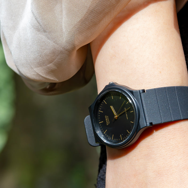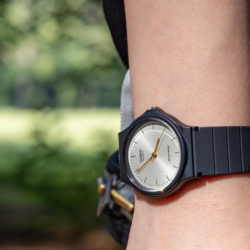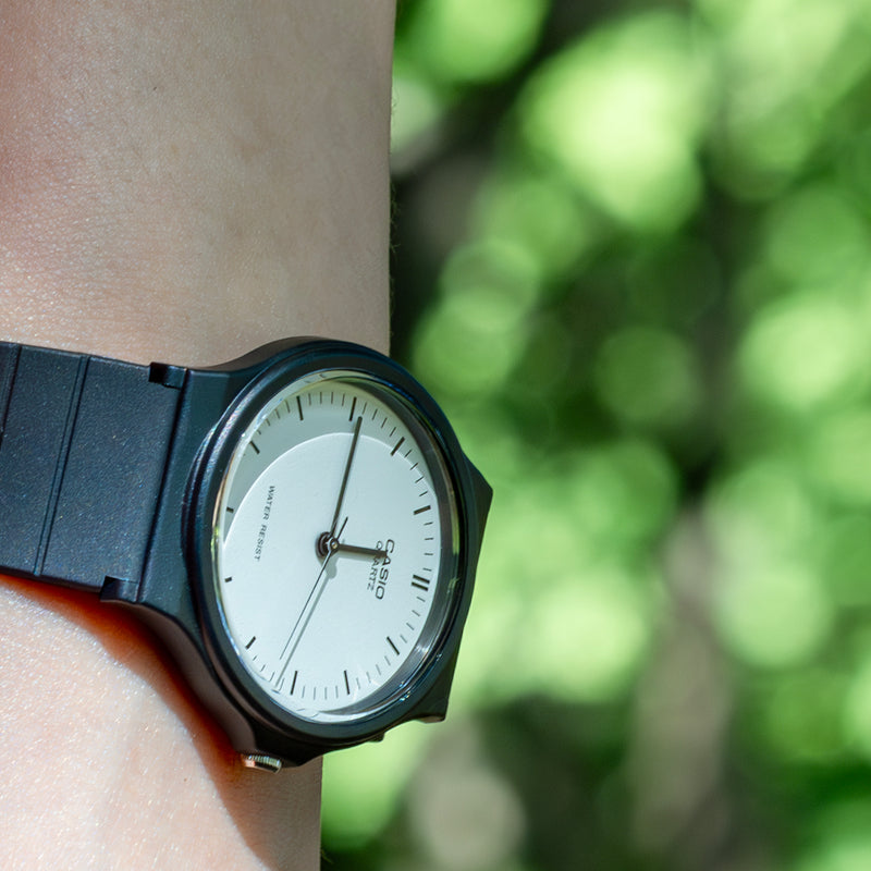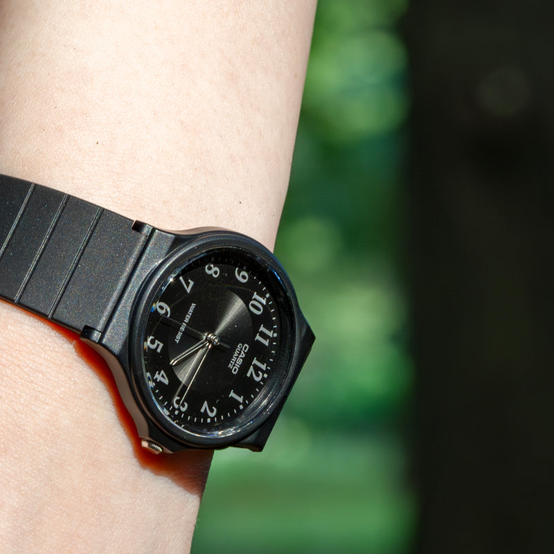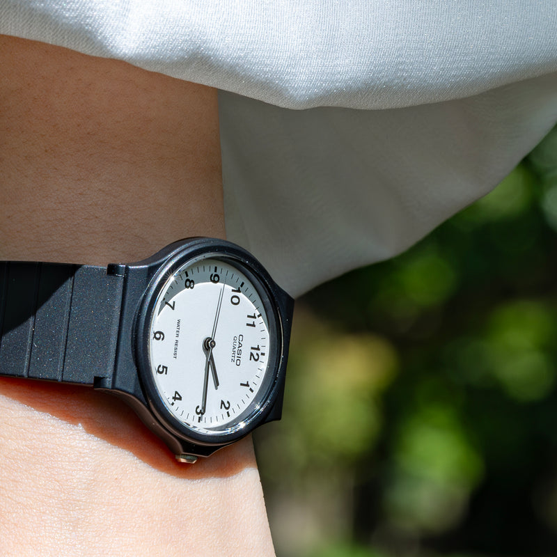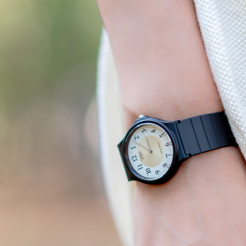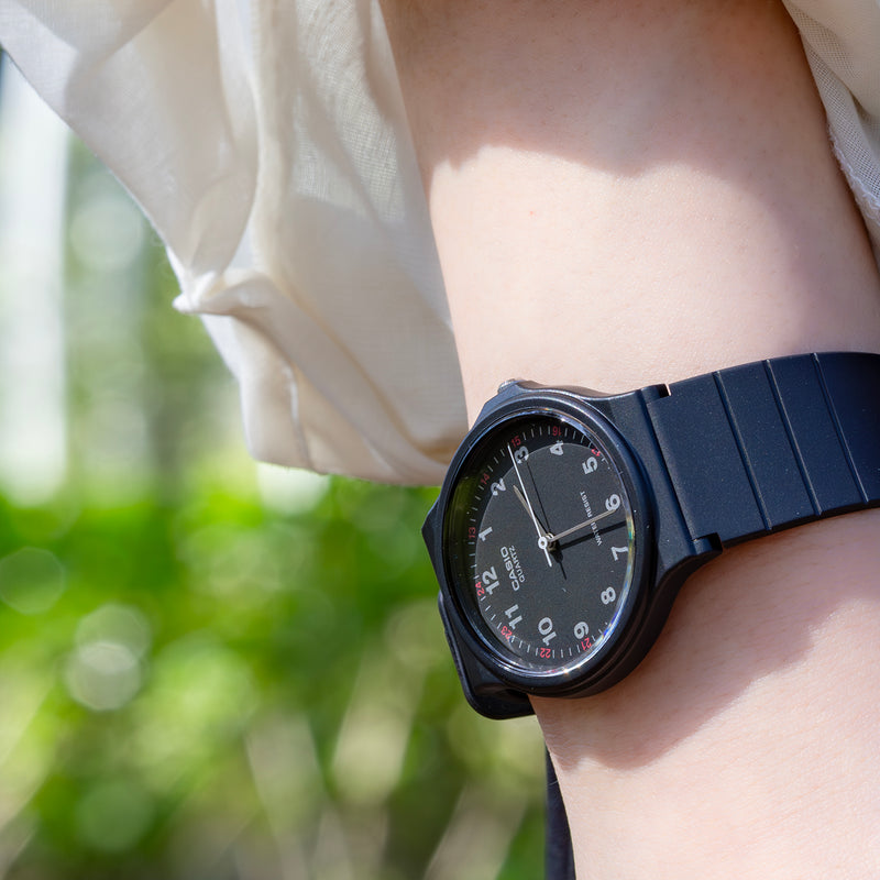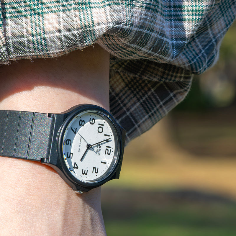 カシオMQ-24は、腕時計に最低限必要なものだけで構成された、究極のミニマルウォッチです。シンプル、時刻が見やすい、軽い、丈夫などは、多くのチープカシオ共通の特徴ですが、MQ-24はその究極形。すべての特徴を高い次元でクリアーしています。針は棒状で、そっけなくも見えますが、時・分・秒それぞれに最適な長さと太さが与えられた、計算され尽くしたデザインです。ラウンド型ケースとストレートなベルトの組み合わせにも無駄がありません。唯一遊び心が見て取れるのが文字盤で、バリエーションモデルごとに、様々な工夫が散りばめられています。 | |