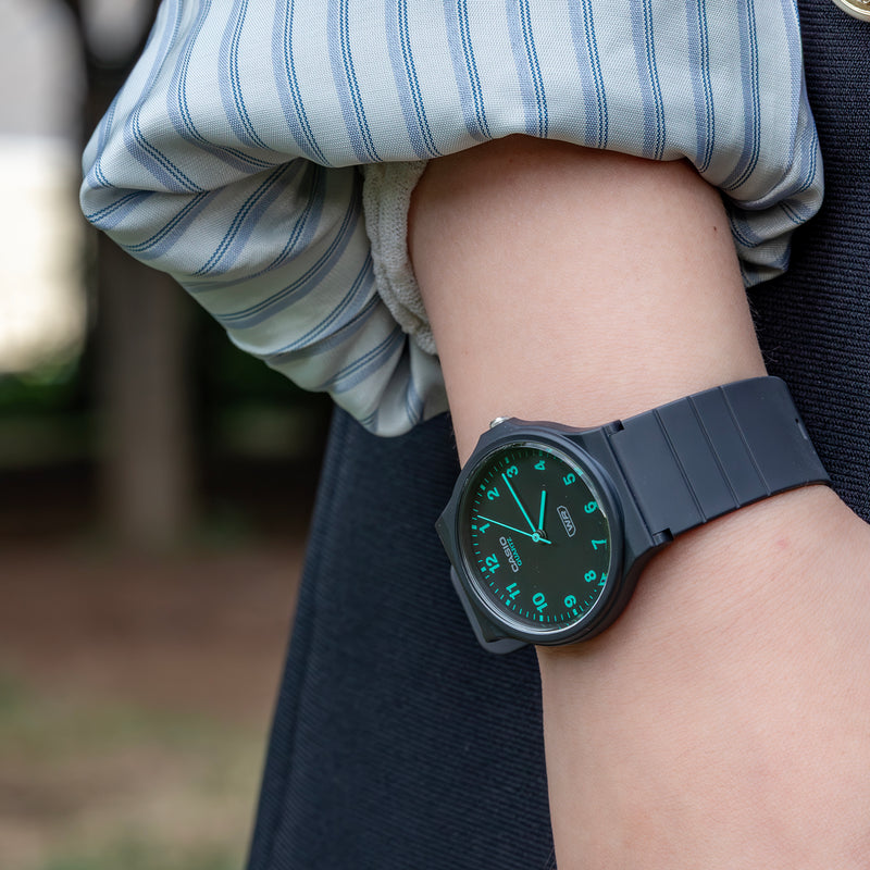 | カシオMQ-24Bは、“チープカシオ”の代表格ともいえる、MQ-24-7Bをベースにしたバリエーションモデルです。シンプルな文字盤と細身の針が特徴的なミニマルなデザインは、どんなスタイルにも自然に馴染みます。色彩が統一されたインデックスと針は視認性にも優れ、シンプルでありながらデザインにこだわりが感じられる一品です。カラーによって印象が大きく変わるので、気分やスタイルに合わせて複数本を使い分けるのも楽しいでしょう。バンドには最新のトレンドであるSDGsを意識し、再生可能な有機資源を原料にしたバイオマスプラスチックが採用されています。定番のブラックバンドはもちろん、ビビッドなカラー展開もあり、遊び心を加えたい日にもぴったりです。華やかなカラーを選べば、手元から元気をもらえるような感覚になるでしょう。シンプルなTシャツやシャツスタイルに合わせるだけで、さりげないアクセントになります。小ぶりなサイズ感なので、腕元を控えめに彩りたい方にも最適です。 | |