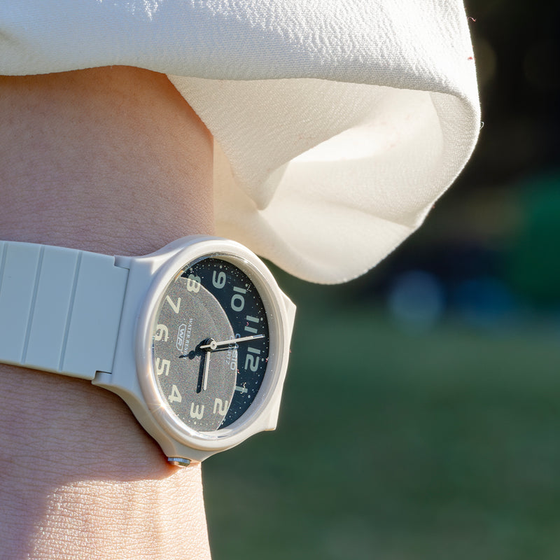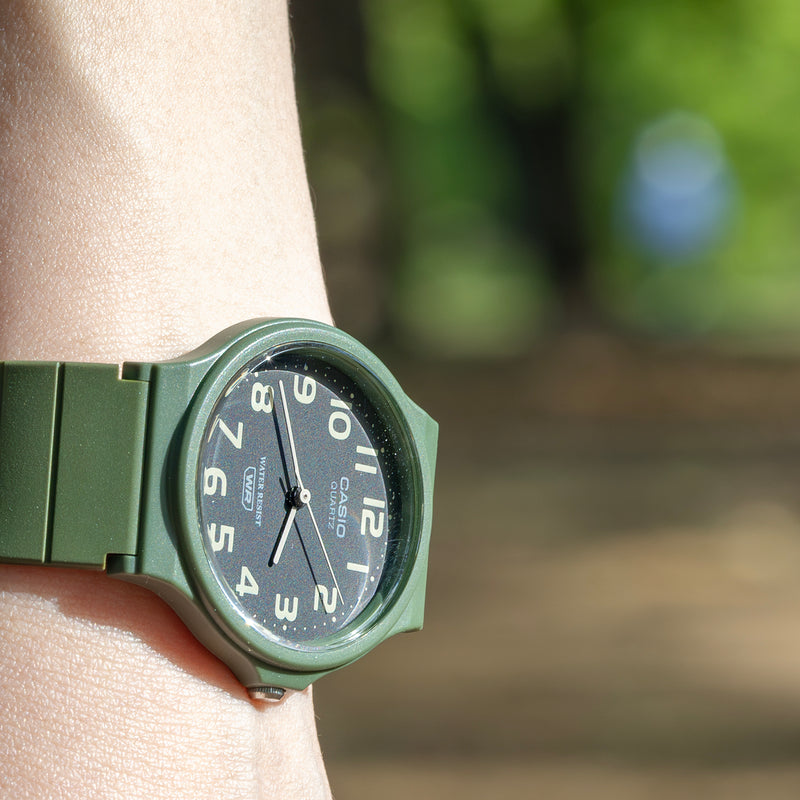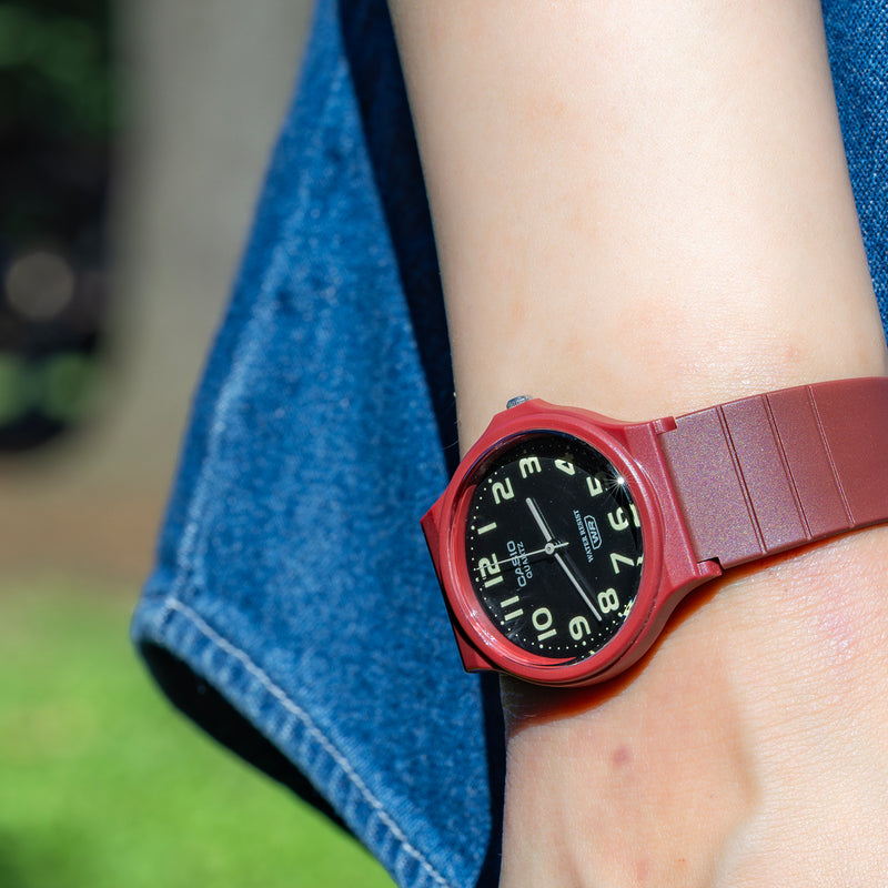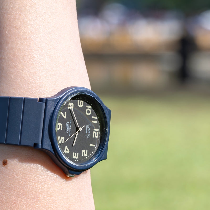 カシオMQ-24は、腕時計に最低限必要なものだけで構成された、究極のミニマルウォッチです。シンプル、時刻が見やすい、軽い、丈夫などは、多くのチープカシオ共通の特徴ですが、MQ-24はその究極形。すべての特徴を高い次元でクリアーしています。針は棒状で、そっけなくも見えますが、時・分・秒それぞれに最適な長さと太さが与えられた、計算され尽くしたデザインです。ラウンド型ケースとストレートなベルトの組み合わせにも無駄がありません。唯一遊び心が見て取れるのが文字盤で、バリエーションモデルごとに、様々な工夫が散りばめられています。 | |