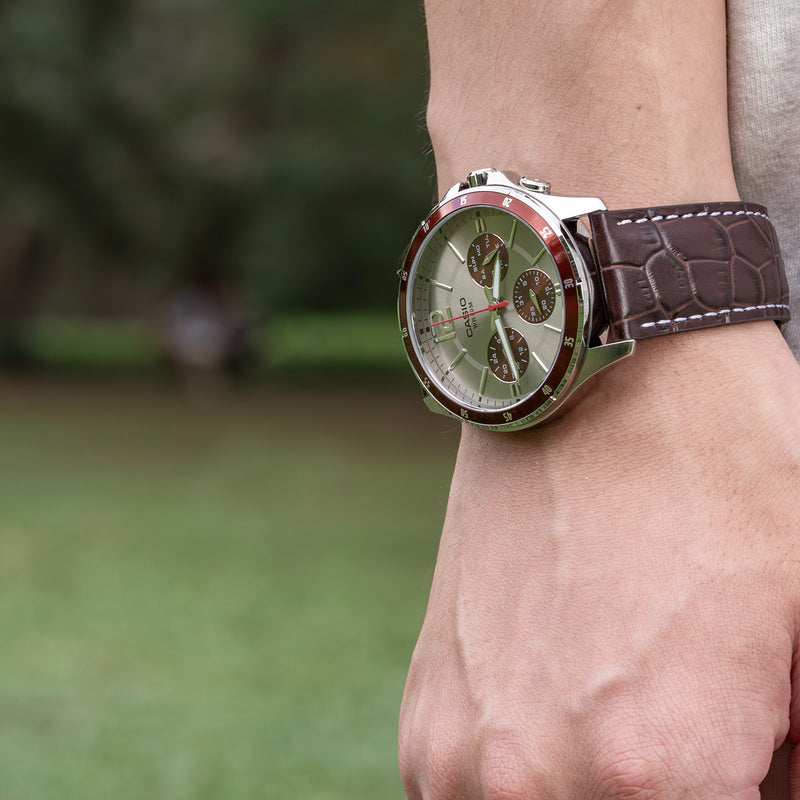 カシオMTP-1374は、メカニカルで精悍なデザインのアナログウォッチです。逆三角形に整列されたインダイアルは、曜日・日付・24時間制の時刻表示で、鋭い菱形の針でその状態を指し示します。日付と曜日はリューズ両隣のプッシュボタンで調整可能で、このボタンの存在がメカニカル感をより一層際立てており、とても精悍な印象です。鋭い剣のような時分針とは対照的に、ベゼルとインデックスは、アルミのような質感のメッキ仕上げで、柔らかい光沢を放っています。