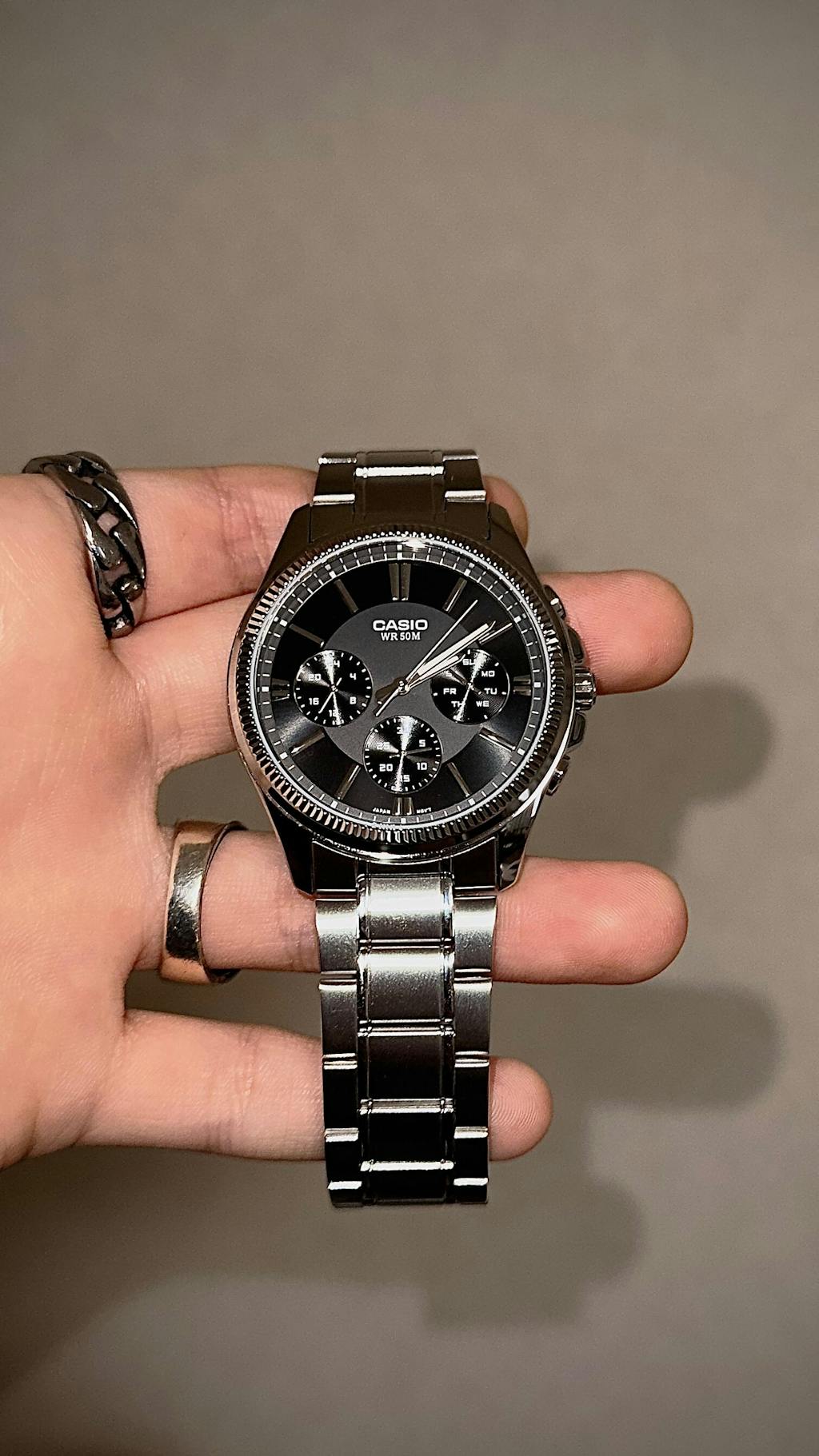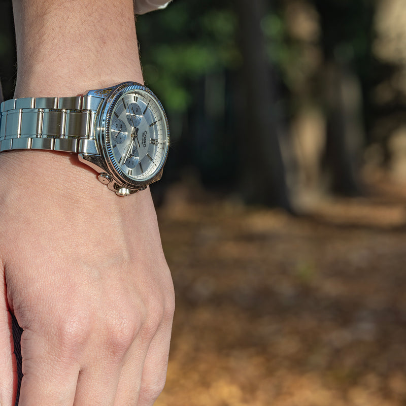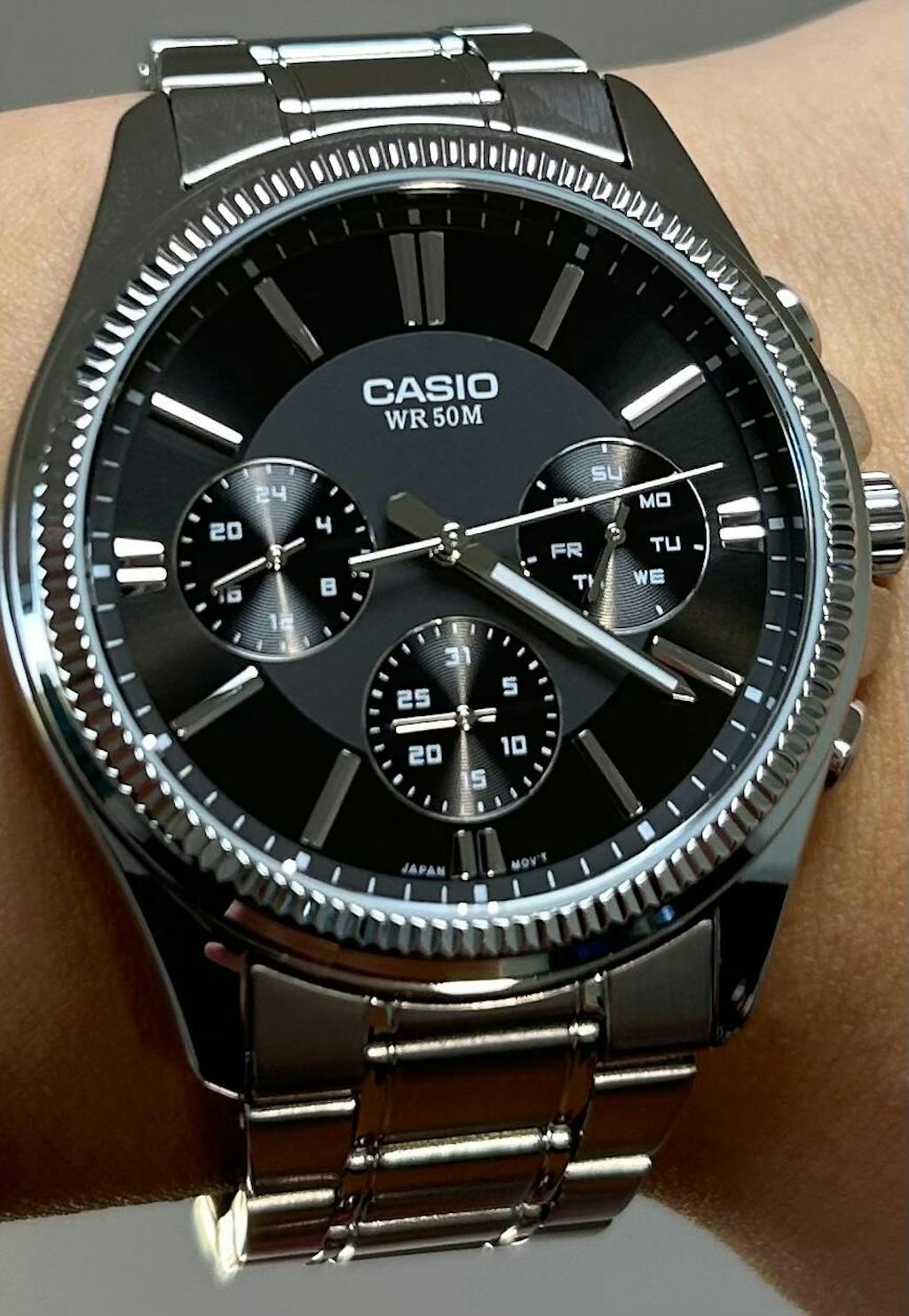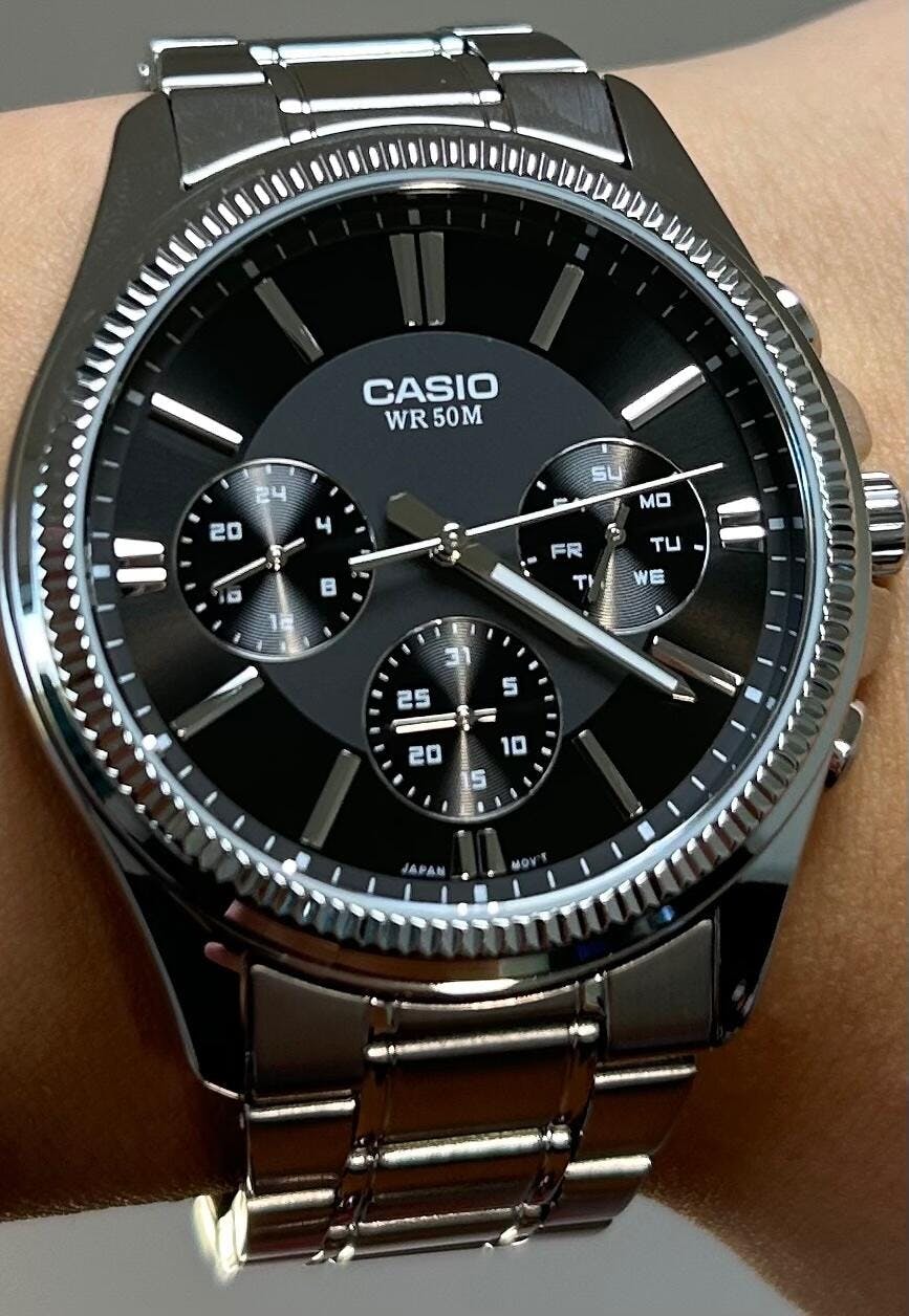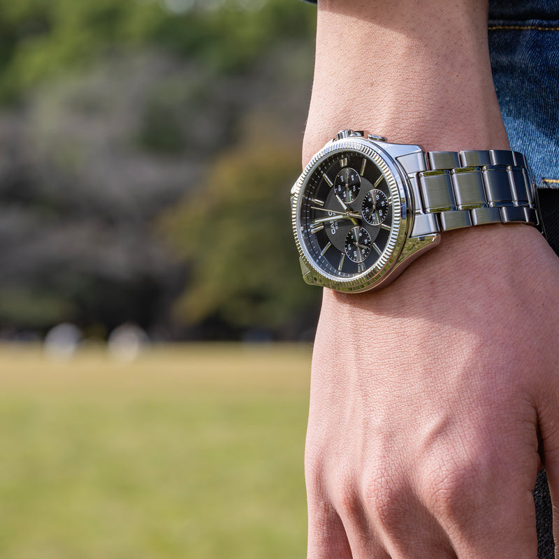 | カシオMTP-1375は、各種パーツがクローム調に磨き上げられた、艶やかな腕時計です。鏡面仕上げのケースの上に、細かい山型の模様が刻まれたフルーテッドベゼルが鎮座し、文字盤を取り囲んでいます。文字盤は、あたかも質感の異なる3枚のディスクが積載されているかのように見える、疑似レイヤー構造で、時分針は夜光付きのペンシル針となっています。インダイアルは、24個の同心円をエンボス加工により連ねた、コンセントリック仕上げです。竜頭上下には、クロノグラフのプッシュボタンを模した、曜日と日付の早送りボタンが設置されています。 | |