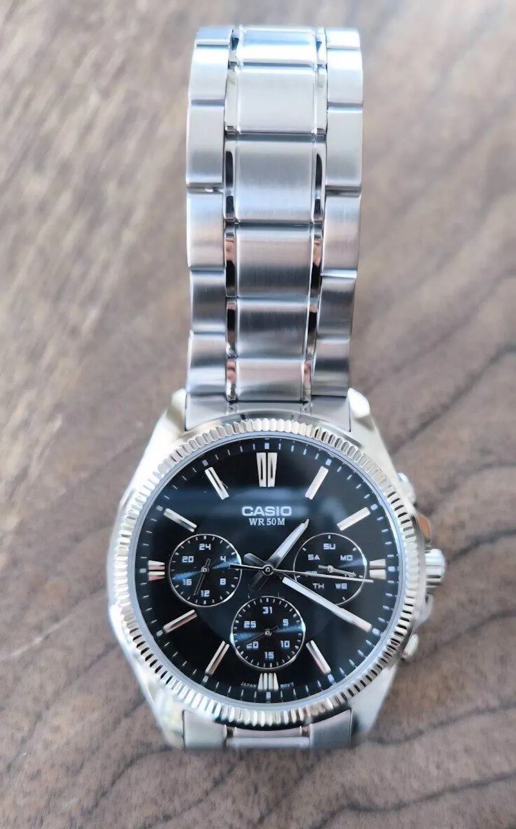 | カシオMTP-1375は、各種パーツがクローム調に磨き上げられた、艶やかな腕時計です。鏡面仕上げのケースの上に、細かい山型の模様が刻まれたフルーテッドベゼルが鎮座し、文字盤を取り囲んでいます。文字盤は、あたかも質感の異なる3枚のディスクが積載されているかのように見える、疑似レイヤー構造で、時分針は夜光付きのペンシル針となっています。インダイアルは、24個の同心円をエンボス加工により連ねた、コンセントリック仕上げです。竜頭上下には、クロノグラフのプッシュボタンを模した、曜日と日付の早送りボタンが設置されています。 | |