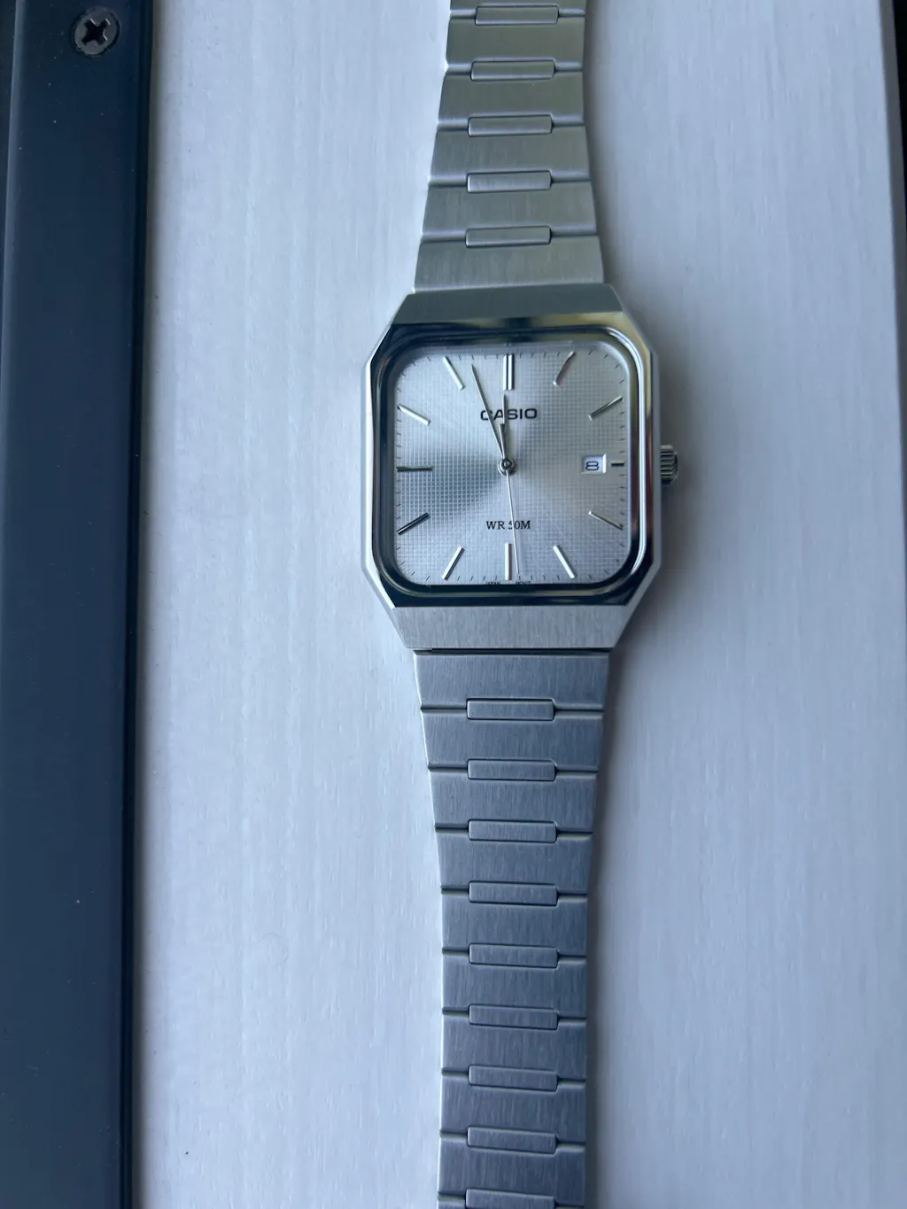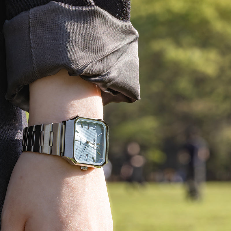 | MTP-B185Dは、名作のデジタルカシオをアナログ版に翻訳したような、懐かしさと新しさを併せ持つ腕時計です。8角形の縦長ケースに、薄型ベルトを組み合わせたデザインは、デジタルのチープカシオをほうふつとさせます。ケースとバンドはどちらもステンレス製で、軽量ながらも耐久性があり、汗や湿気に強く、日常使いにも安心な設計です。本体とベルトの接続部は、すき間が目立たない構造になっており、一体感のある美しいシルエットに仕上がっています。文字盤のデザインも秀逸です。盤面には微細な格子模様が刻まれており、光が当たるたびに立体的で繊細な輝きを見せてくれます。3時位置の日付枠は、文字盤に溶け込むように設計された、控えめなデザインです。やや長めの秒針は、カウンターウェイト(針の後ろに伸びた錘)の形状もすっきりと美しく、その動きを目で追うだけでも楽しめます。シルバー×ブラックの定番モデルから深みのあるネイビー系まで、文字盤カラーや外装仕上げが異なる複数のバリエーションが揃っているので、好みに合わせた一本がきっと見つかることでしょう。アナログにしか出せない針の存在感と、デジタルチープカシオ譲りの親しみやすさを兼ね備えています。日々のコーディネートに、さりげなく品格を添える一本としておすすめしたい腕時計です。 | |