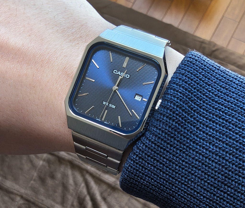 MTP-B185Dは、名作のデジタルカシオをアナログ版に翻訳したような、懐かしさと新しさを併せ持つ腕時計です。8角形の縦長ケースに、薄型ベルトを組み合わせたデザインは、デジタルのチープカシオをほうふつとさせます。ケースとバンドはどちらもステンレス製で、軽量ながらも耐久性があり、汗や湿気に強く、日常使いにも安心な設計です。本体とベルトの接続部は、すき間が目立たない構造になっており、一体感のある美しいシルエットに仕上がっています。文字盤のデザインも秀逸です。盤面には微細な格子模様が刻まれており、光が当たるたびに立体的で繊細な輝きを見せてくれます。3時位置の日付枠は、文字盤に溶け込むように設計された、控えめなデザインです。やや長めの秒針は、カウンターウェイト(針の後ろに伸びた錘)の形状もすっきりと美しく、その動きを目で追うだけでも楽しめます。シルバー×ブラックの定番モデルから深みのあるネイビー系まで、文字盤カラーや外装仕上げが異なる複数のバリエーションが揃っているので、好みに合わせた一本がきっと見つかることでしょう。アナログにしか出せない針の存在感と、デジタルチープカシオ譲りの親しみやすさを兼ね備えています。日々のコーディネートに、さりげなく品格を添える一本としておすすめしたい腕時計です。