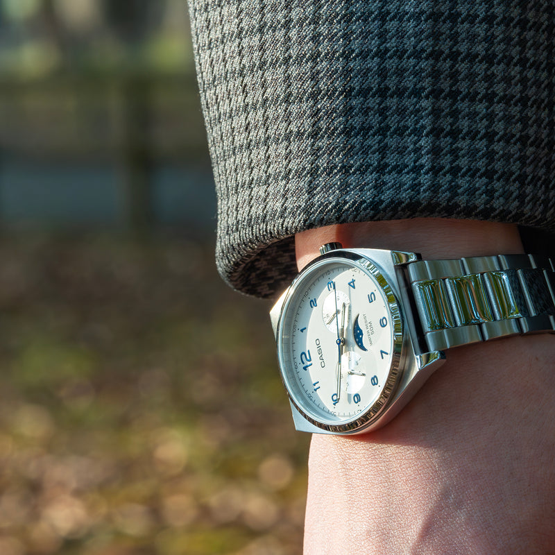 カシオMTP-M300は、クラシカルなデザインと機能が魅力的な腕時計です。特に目を惹くのが6時位置のムーンフェイズで、扇状の小窓に月の満ち欠けが表示されます。ムーンフェイズは腕時計の中でも特に精緻な機構の一つで、その美しさと機構の複雑さから、機能性以上の価値を持つ装飾品やステータスシンボルとして高級時計に搭載されました。富裕層にとってムーンフェイズは、単なる月の満ち欠けを知るための機構ではなく、所有すること自体が一種のステータスを示すものだったのです。カシオMTP-M300は、この伝統と技術を受け継ぎ、機能美を楽しむためのアイテムとなっています。文字盤には立体植字されたアラビア数字のインデックスが配され、モダナイズされたトノーケースが腕時計全体のデザインを引き立てます。トノーケースとは、樽を意味するフランス語(トノー)に由来するケースデザインで、その独特の曲線美が特徴です。カシオMTP-M300は、このトノーケースを現代風にアレンジし、クラシックな魅力とモダンなスタイルを見事に融合させています。 | |