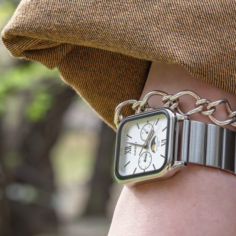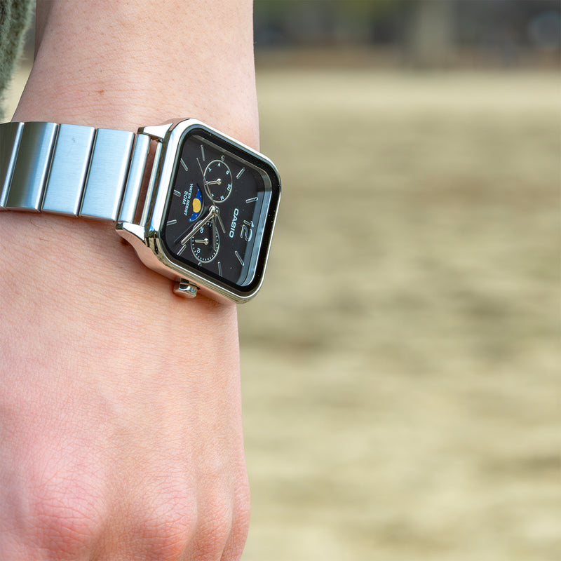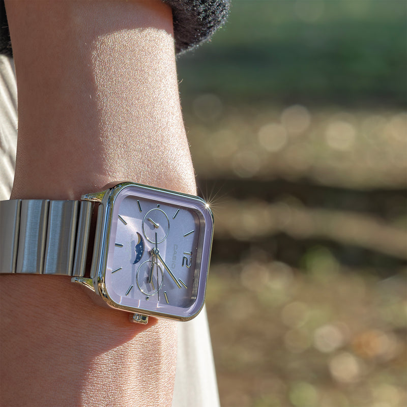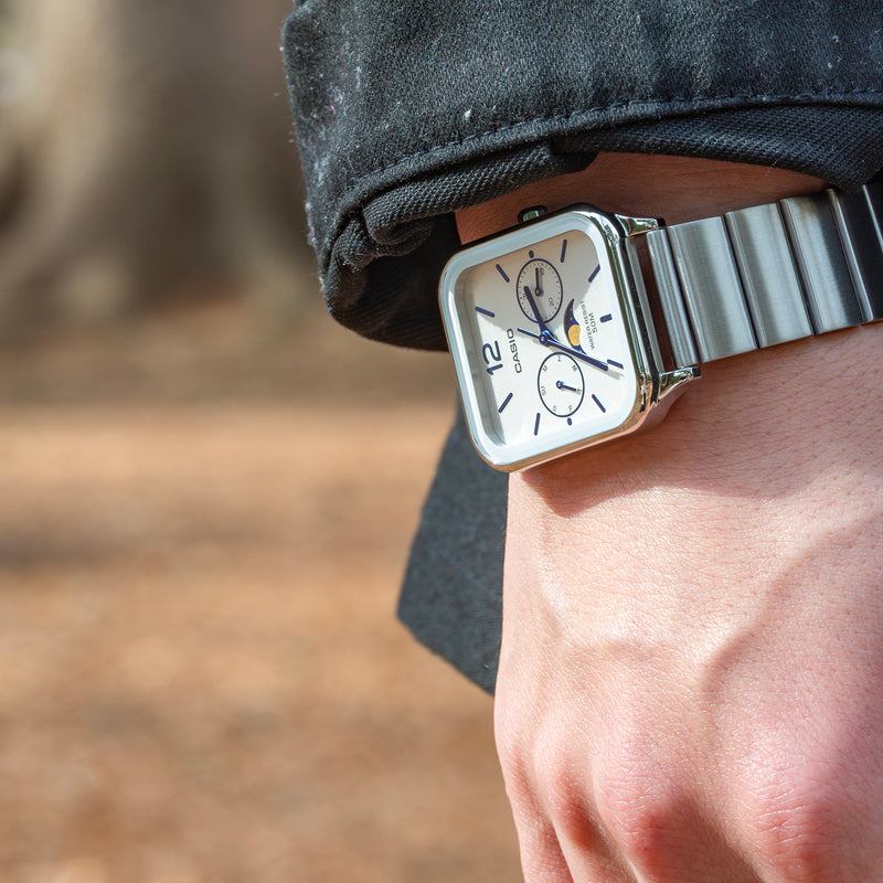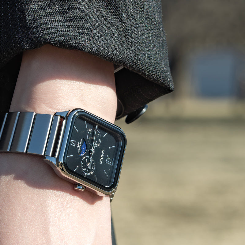カシオMTP-M305シリーズは、日常に特別なエレガンスを加えたい方に最適な腕時計です。特筆すべきは、6時位置のムーンフェイズ機構で、月の満ち欠けをロマンティックに表示します。この機構は、上下2か所に月を描いたディスクを59日周期で一周させ、ディスク上半分を見せることで月の相を示すという独特な技術で構築されています。約29.53日の月の公転周期に基づいたこの機構は、時計技術者の知恵の結晶であり、誤差を最小限に抑えます。かつて航海者が潮の満ち引きを知るため活用したムーンフェイズ機構は、今では時計の顔を飾る美しい装飾となっています。長方形のスタイリッシュなケースは、スマートウォッチを彷彿とさせるモダンなデザインで、都会的な印象を与えます。蛇腹のステンレスベルトは、レトロな魅力を現代に蘇らせ、どんな装いにも洗練されたアクセントを加えるでしょう。 | |