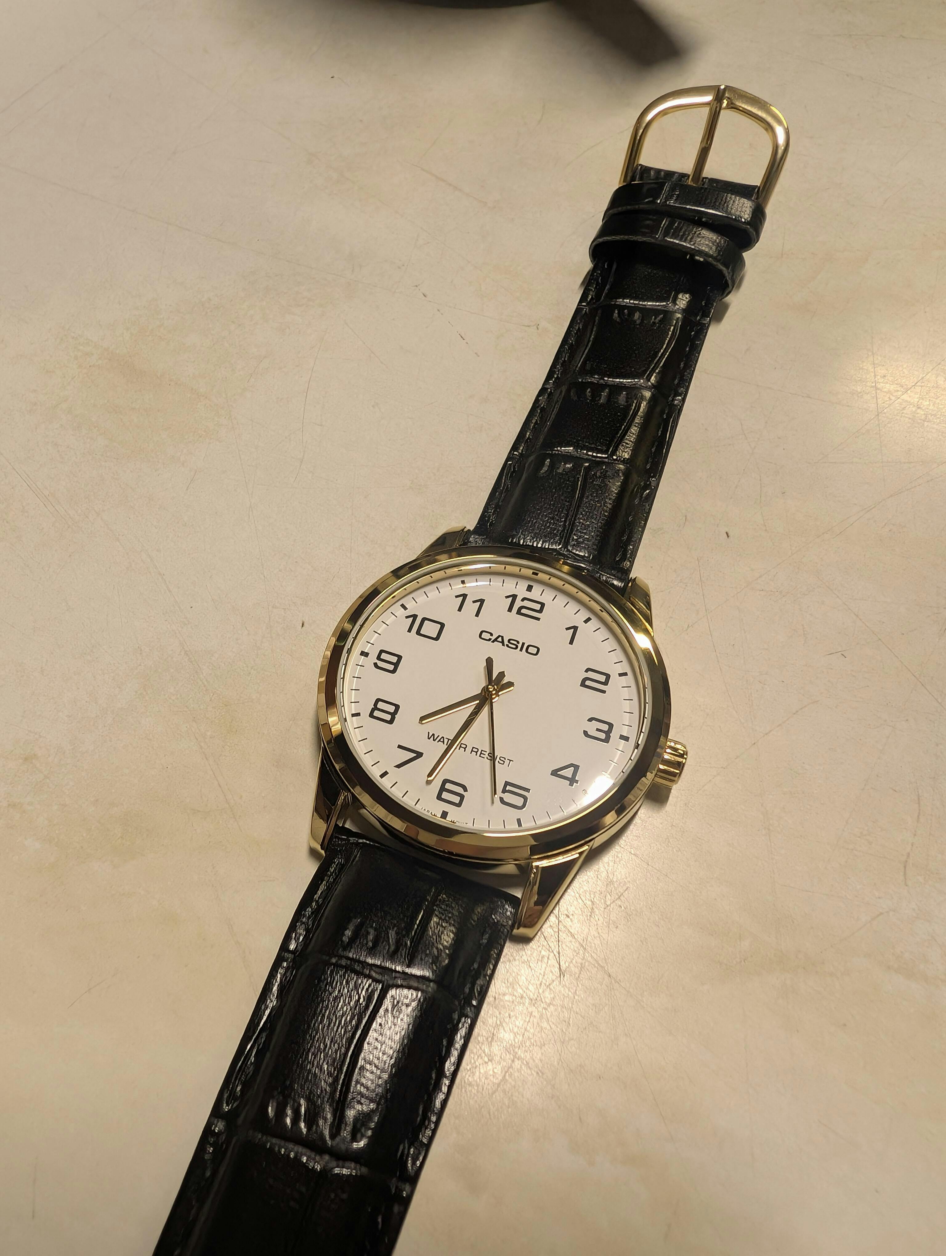| カシオMTP-V001は、けれんみのないオーソドックスな腕時計です。レトロともモダンともとれる、独特な書体のアラビアインデックス(数字)が、この腕時計のイメージを決定づけるキービジュアルで、ケース、文字盤、針、インデックス、ベルトに用いられた素材、色調の組み合わせの妙により、ドレッシーな風格を創出しています。厚さ8mmの薄型ケースは、袖の中に納まりやすく、フォーマルな装いにも合わせやすいサイズです。 | |
