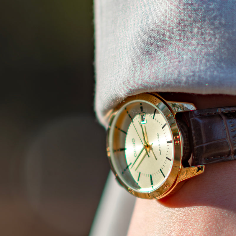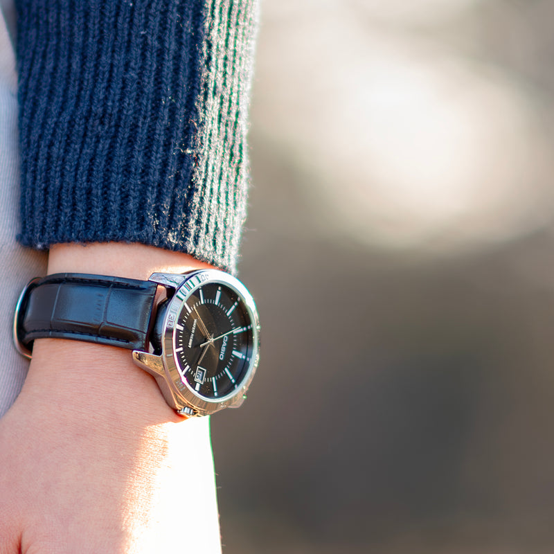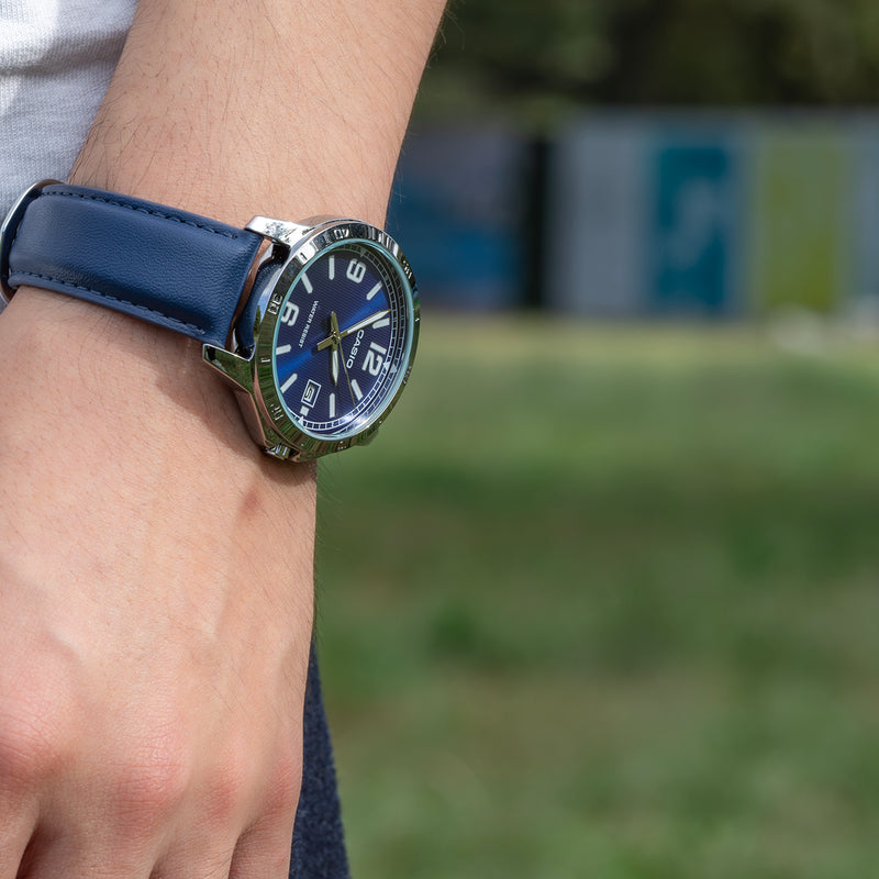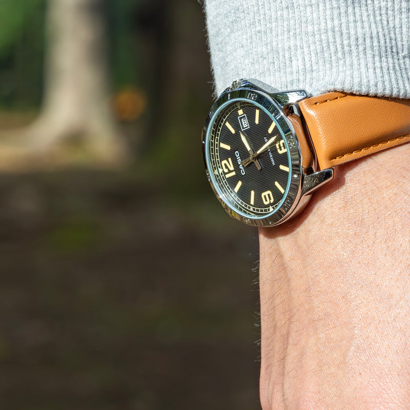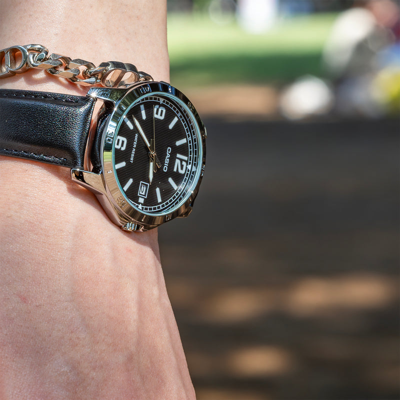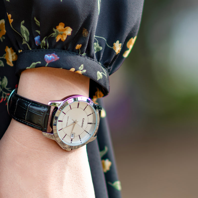 カシオMTP-V004は、メンズサイズの腕時計ですが、女性からの人気も高いモデルです。ビジネス・フォーマル寄りとカジュアル寄りの2系列に分かれているのが特徴です。ビジネス・フォーマル寄りモデルは、ドルフィン針と、サンレイ文字盤の組み合わせ。インデックスを文字盤内周に整列させ、あえて短めの針を選ぶことで、格式高いデザインに仕立てています。クロコダイル風の合皮ベルトもクラシカルです。一方のカジュアル寄りモデルは、バトン針とストライプ文字盤の組み合わせ。アラビア数字と極太バーの混合インデックスがスポーティーで、エッジの効いた針との相性も抜群です。プレーンな合成皮革ベルトが、カジュアルなデザインを引き立てています。 | |
