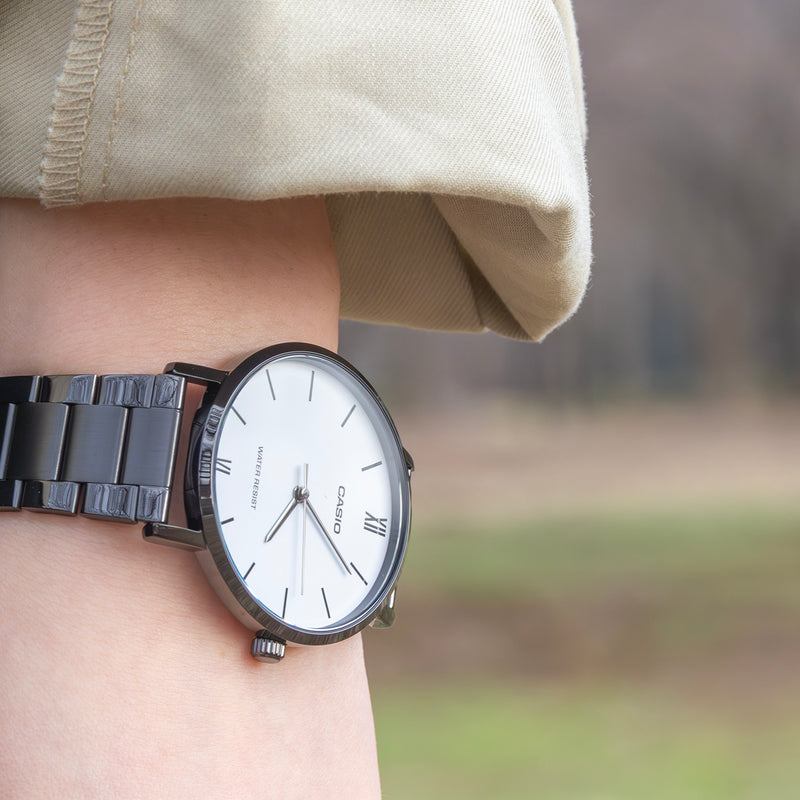 カシオMTP-VT01は、バウハウスのデザイン理念(無用な装飾を排除した合理的なモダンデザイン)を採用した、実用性重視の腕時計です。機能性と生産性を最大限に極めるため、腕時計を構成するパーツは、すべて必要最小限の素材・形態で生成されており、一切の無駄がありません。その一方で、見栄えという(狭い意味での)デザイン性も高いレベルに引き上げられており、ドレスウォッチとしての使用にも堪えうる実力も兼ね備えています。 | |