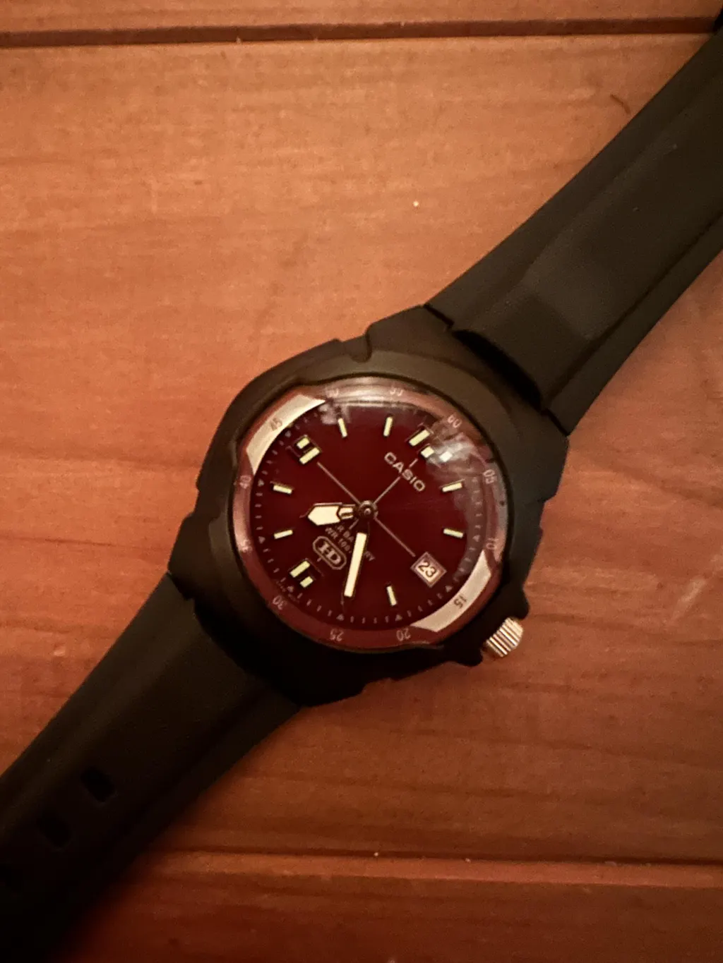 | カシオMW-600Fは、10年電池と10気圧防水機能を備えた、とてもタフな腕時計です。その証に「丈夫な」「酷使に耐える」という意味の「Heavy Duty」を図案化した「HDマーク」が、6時位置に記されています。テジューの符を模したかのような、エンボス風の突起パターンがベルトに刻まれていたり、メッキバーツのインデックスが文字盤に植字されていたりするなど、廉価な腕時計ながらもマテリアル感は上質です。時分針に夜光塗料が塗布されているため、暗闇でも容易に時刻が確認できます。 | |