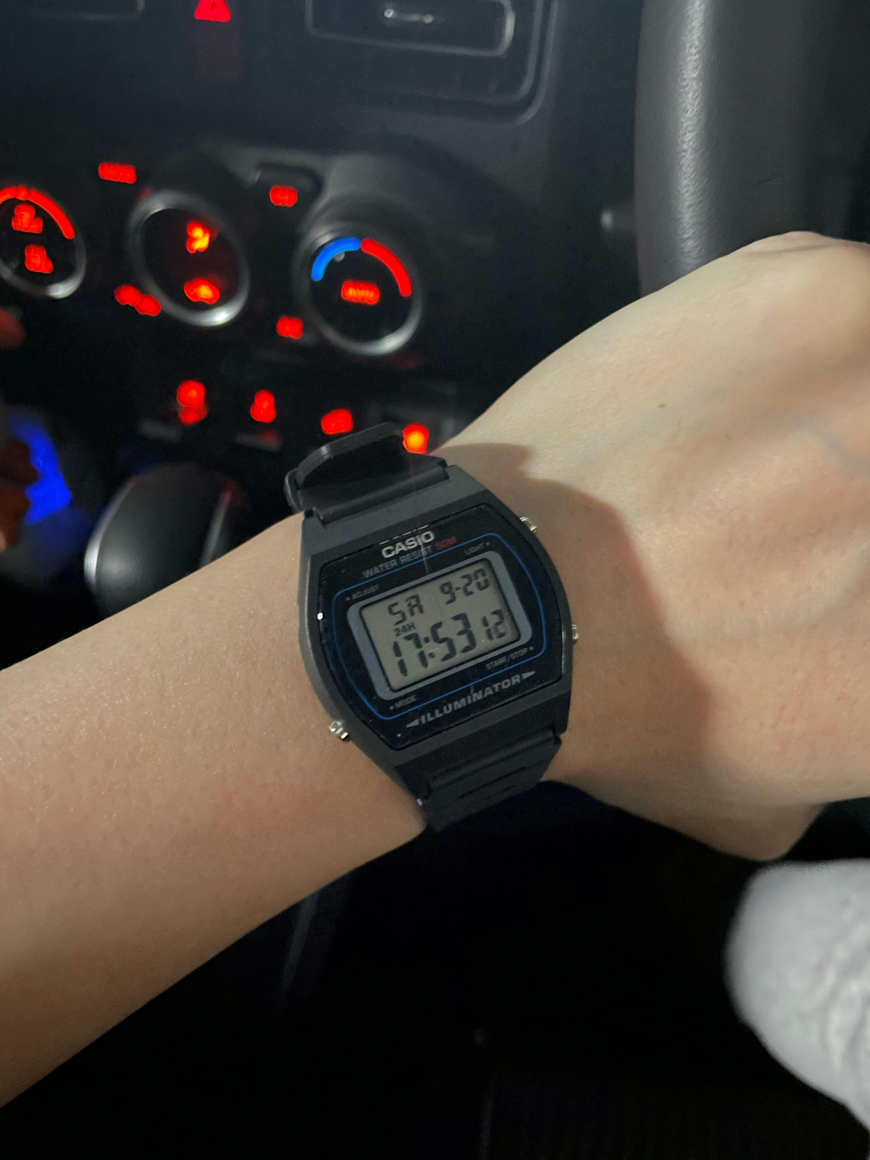 カシオW-202は、70年代の面影を色濃く残した、レトロなデジタルウォッチです。コロンとした樽型のケースが、このうえなく愛らしく、数あるチープカシオの中でも唯一無二の存在といえるでしょう。ケースは樹脂製ですが、つや消しに近い半光沢の金属風塗装が施してあるため、その質感はアルミニウムのようです。製造上、避けることのできないケース側面のパーティングラインは、デザインの一部として馴染んでいるので、全く違和感がありません。文字盤がスッキリ洗練されているのも特徴の一つで、さりげない高級感をもたらしています。 映画「君の名前で僕を呼んで」ティモシー・シャラメ着用 |