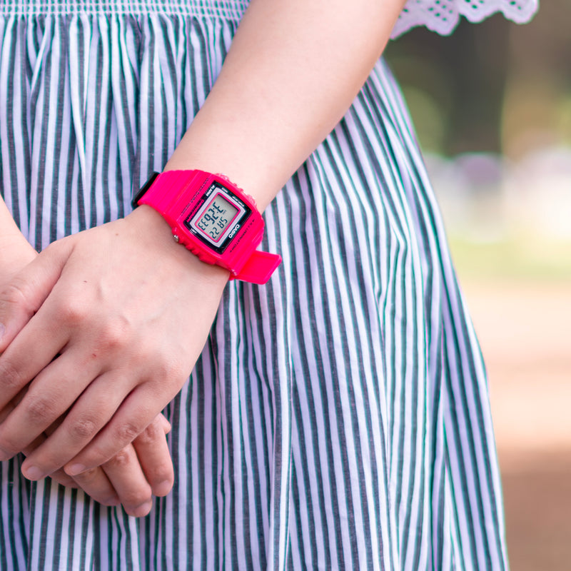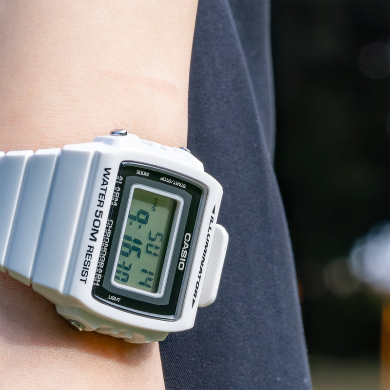 カシオW-215Hは、グロス調のビビッドカラーがひときわ目を惹く、ファッショナブルな腕時計です。G-SHOCKやBABY-Gのテイストを取り入れつつも、どのG-SHOCKやBABY-Gにも似ていない、オリジナリティーあふれるデザインに仕上げられています。ケースとベルトが完全に一体化したフォルムは、スタイリッシュそのものです。実用面でもハイレベルで、デジタル数字はクッキリ黒く表示され、時刻が容易に確認できます。 | |