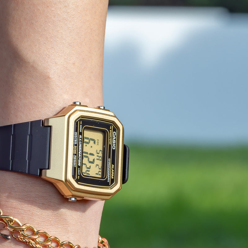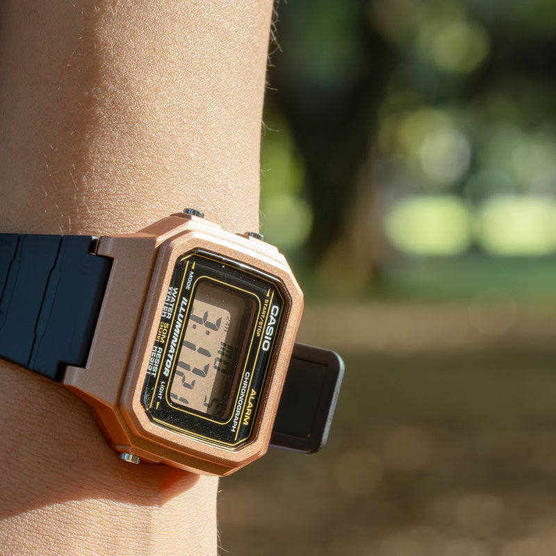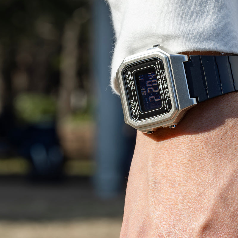 カシオW-217は、ビッグサイズのスタンダードデジタルウォッチです。伝統的なカシオのスタンダードデジタルよりも、面積比で約1.3倍に大型化されています。同時に、7セグメントのストロークも拡張され、太くて力強いフォントにモディファイされました。ボタンの操作体系も刷新され、ライトの点灯は右下ボタンで行います。