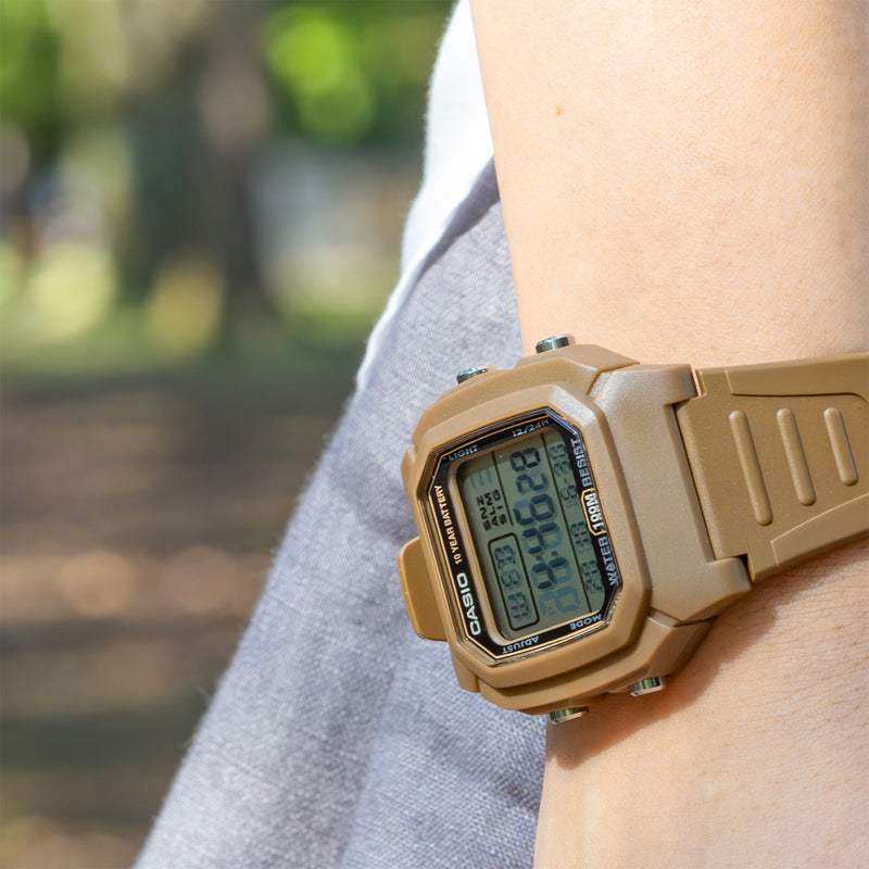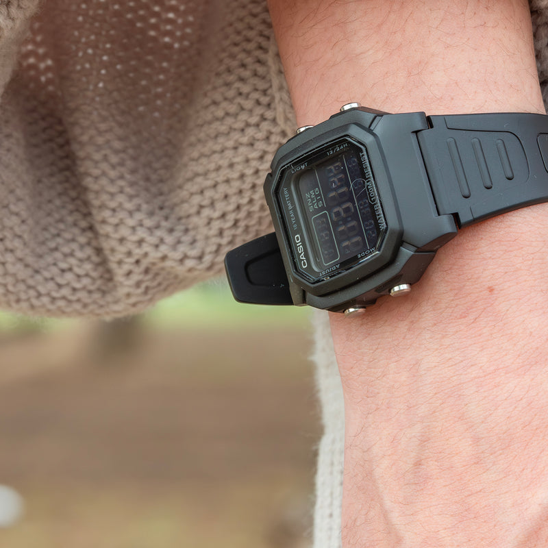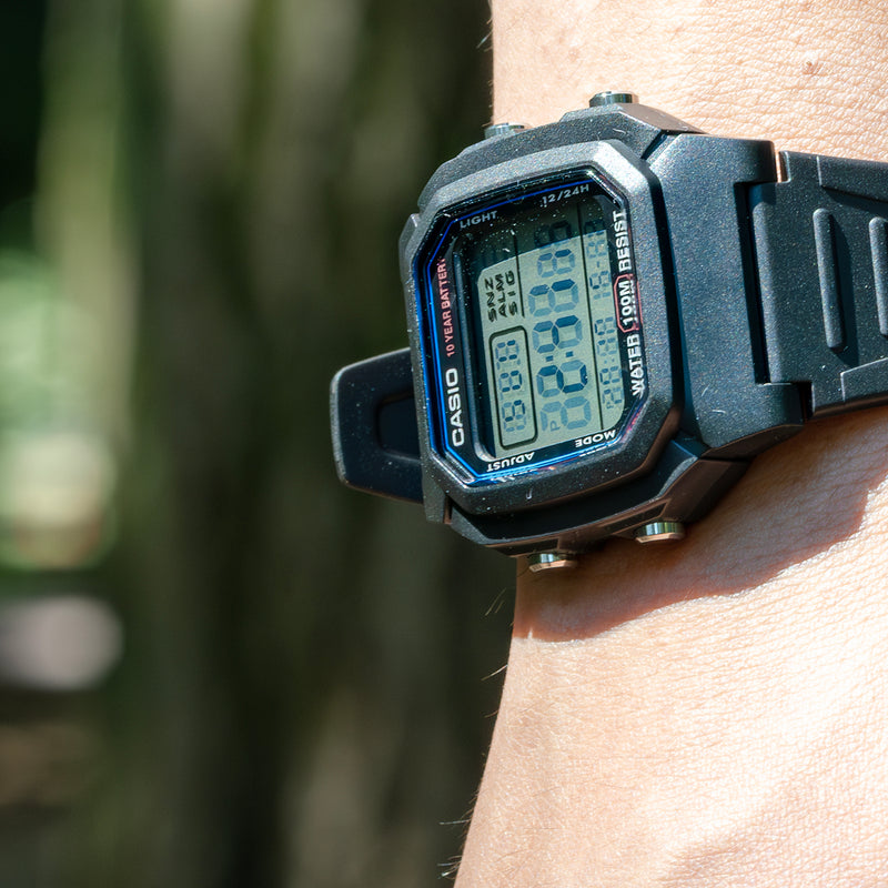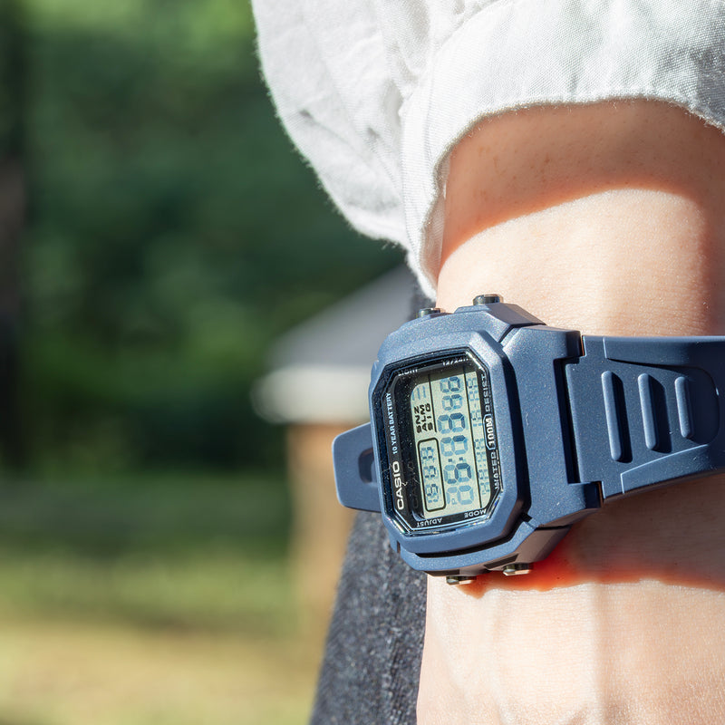 カシオW-800は、ストイックなまでに実用性を追求した、機能美溢れる腕時計です。ディスプレイはベルト幅に迫る勢いの大型サイズで、年月日・曜日・時分秒をフル表示します。直線で構成されたフォントは読みやすいうえ、1と7の誤読防止効果を狙った左縦棒のある「ワ」型の「7」を採用するなど、実用性の高いデザインです。カウントダウンタイマーこそ未搭載ですが、全てのモードで現在時刻が表示されるため、アラームとストップウォッチの併用で代替できます。G-SHOCKの5000 / 5600シリーズに通じる8角形のフォルムには重厚感があり、これぞカシオのデジタルウォッチといった意匠です。 映画「パトリオット・デイ」マーク・ウォールバーグ着用 / W-800H-1A |