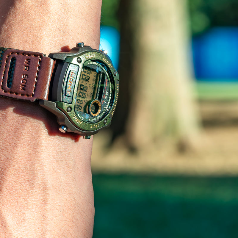 カシオW-94HF-3Aは、スタイリッシュで機能性に優れた腕時計です。ナチュラルカラーのブラウンとモスグリーンの配色は、ミリタリースタイルやアウトドアファッションと絶妙にマッチします。バンドはブラウンの革とモスグリーンのナイロンの組み合わせで、デザイン性と耐久性を兼ね備えた構成です。ラメ入りのモスグリーンベゼルは、デザイン性を高めて腕時計の魅力を引き立てています。液晶画面は見る角度によって表情を変え、斜めから見ると革バンドと調和するブラウンに、正面から見るとホログラム風に輝くグリーンに見えます。機能面では、経過通知機能付きのカウントダウンタイマーが特に優れており、残り1分までは毎00分に、残り1分を切ると10秒毎に、4秒前からは1秒毎に発音して途中経過を通知します。オートリピートタイマーも設定できるので、繰り返し使用するシーンにも役立ちます。ライトブルーのELバックライトが搭載されているので、暗所でも時刻を確認しやすくなっています。 | |